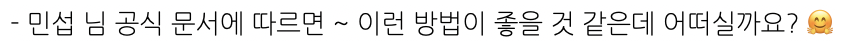 - 민섭 님 이렇게 구현하면 안 될 것 같습니다. (공식 문서에 따르면) ~ 이런 방법이 좋을 것 같은데 어떠실까요?