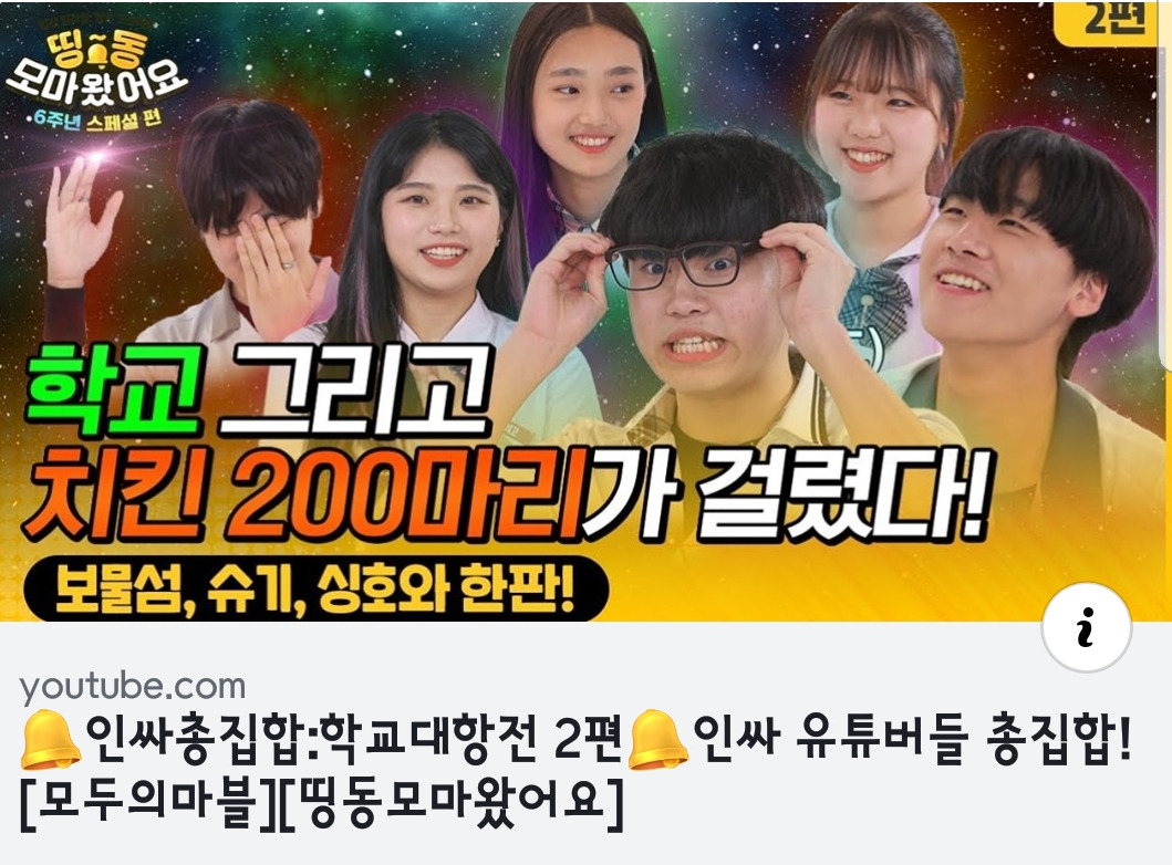 "엄마, 엄마, 나 모마 TV 인싸 유튜버들 학교대항전에 100대 1의 경쟁률을 뚫고 출연했어. 응원 댓글 1등 하면 학교로 치킨 내 이름으로 2백 마리 보내준대. 빨리 좋아요 누르고 댓글 달아줘.