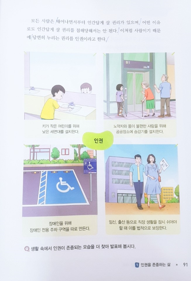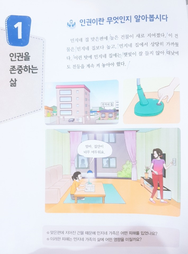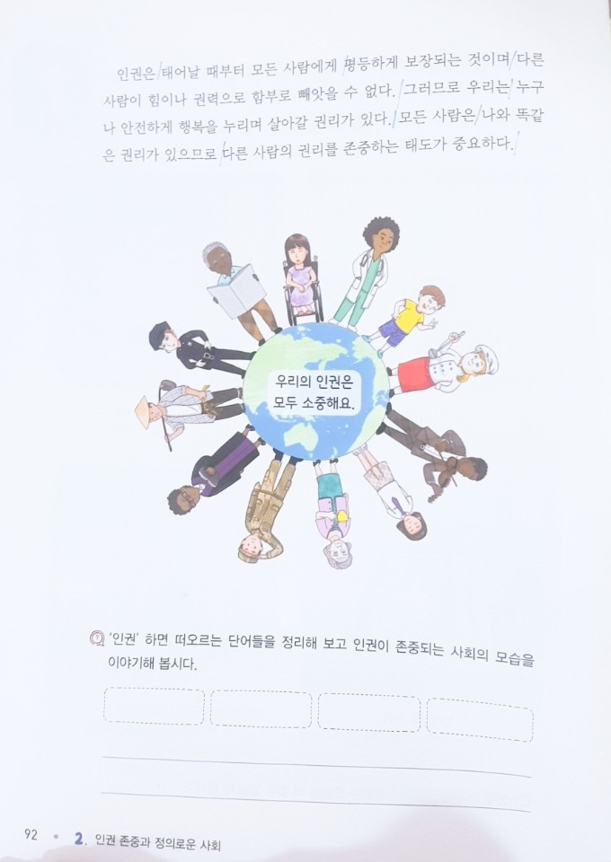 요즘 아이들은 공부할 때 교과서를 잘 보지 않는다. 하지만 나는 공부할 때 제일 우선되어야 하는 교재가 교과서라고 생각하기 때문에 처음 단계에서는 교과서를 읽힌다. 그런데 학생들은 생각보다 교과서 이해하기를 어려워한다. 가만히 살펴보니 단어의 뜻을 모를 때 이해하지 못해는 경우가 많았다. 교과서는 주로 설명하는 형태의 글로 되어 있다. 그래서 단어를 모르면 개념을 이해하기가 어렵다. 개념을 이해하지 못하면 심화 단계로 넘어가지 못하는 것은 당연한 일이다. 다음은 2019년 5학년 사회 교과서 2단원 「인권 존중과 정의로운 사회」이다.