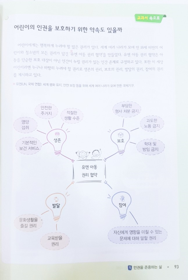 공부의 처음 단계에서 모르는 단어들을 사전에서 찾아 의미를 파악했다면 두 번째 단계에서는 대단원 제목과 중단 원제목, 소단원 제목과 소주제까지 제목과 내용과의 관계를 살펴보면서 핵심 내용을 파악하게 한다. 이때는 제목에 대한 내용을 스스로 정리하여 이야기할 수 있는 것을 목표로 한다. 대단원 Ⅱ. 인권 존중과 정의로운 사회에서 중단원 1단원 제목은 '인권을 존중하는 삶'이다. 이때 소제목 중 하나인 '어린이 인권을 보호하는 약속도 있을까'를 살펴보자. 제목에서도 알 수 있듯이 어린이의 인권에 대한 내용을 중심으로 살펴보아야 한다는 것을 알 수 있다.