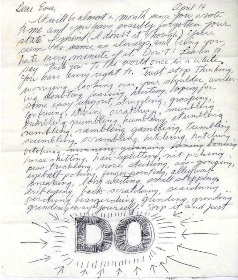하지만, 불행의 여신은 끝내 그녀를 놔두지 않았습니다. 솔 르위트의 편지로 힘을 얻고 작품활동을 다시 시작한지 5년이 되던 어느 날, 그녀는 뇌종양 판정을 받게 됩니다. 결국 그녀는 모든 고통과 함께 이 말을 남기며 세상을 떠납니다.