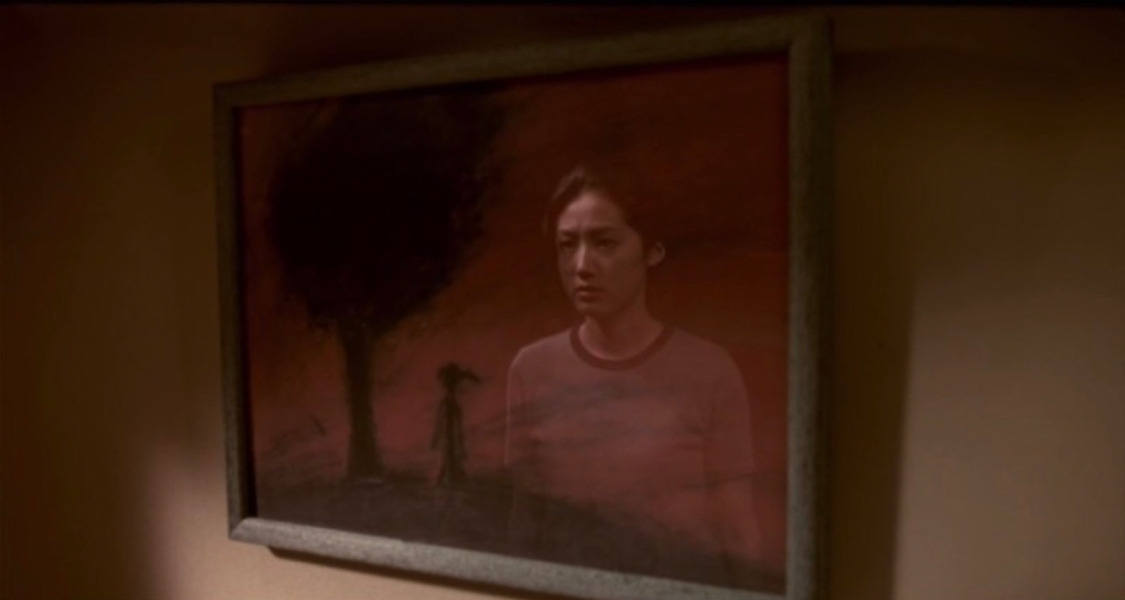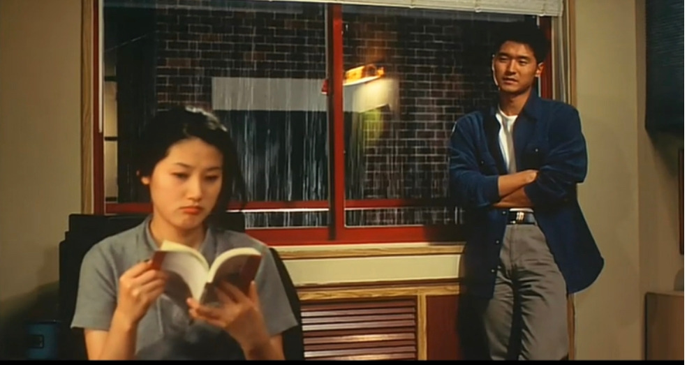 철수는 비 오는 창가에서 실연의 아픔을 받아들이고 있다. 춘희는 뒤에서 책을 읽어준다.
