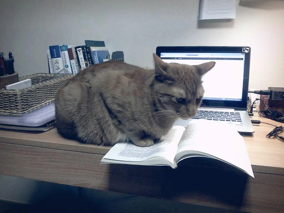 공포감도 외로움을 압도하지는 못했다. 이러나저러나 츠동이는 우리 집에서 내가 기댈 수 있는(?) 유일한 생명체였다. 처음에는 데면데면했던 우리 사이는 점점 가까워지고 있었다. 학교 과제를 하느라 책상 앞에서 무언가 몰두하고 있으면 어느새 뛰어올라 노트북이나 책 위에 배를 까고 벌러덩 드러눕곤 했다. 고양이가 컴퓨터를 사용 중인 집사를 방해하는 이유는 다양하다. 모니터 속에서 움직이는 커서가 신기해서, 컴퓨터가 따뜻해서. 그렇지만 가장 큰 이유는 심심하기 때문이라고 한다... “어서 나를 만져라, 집사야” 건방진 녀석들... 매력적이야.