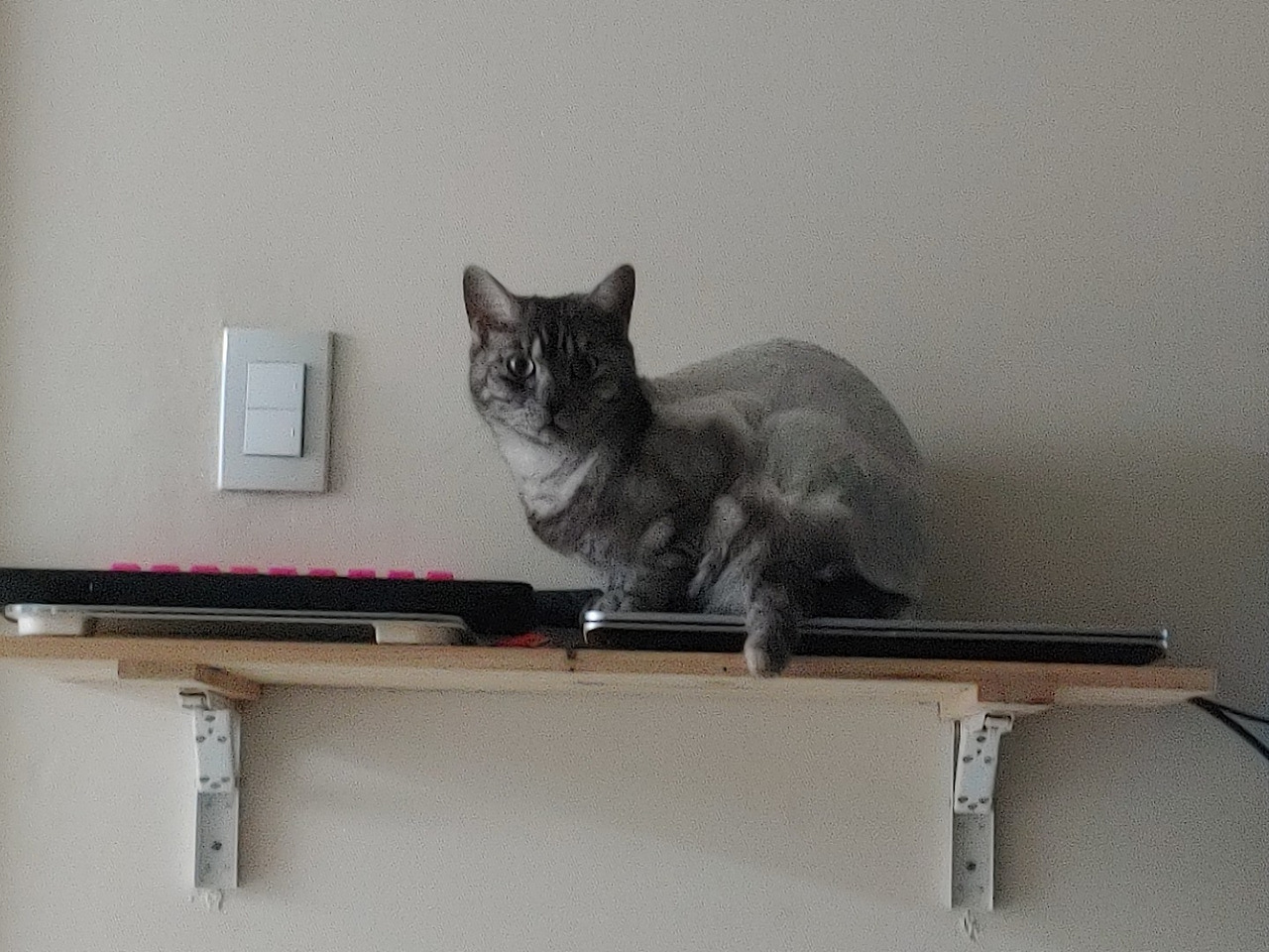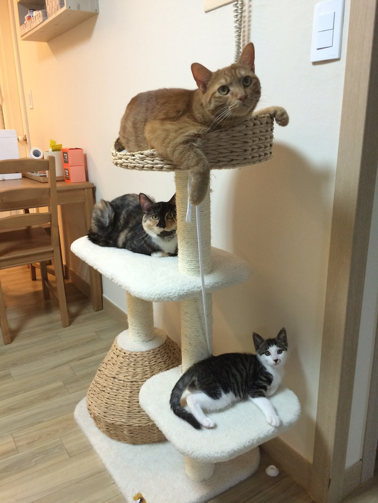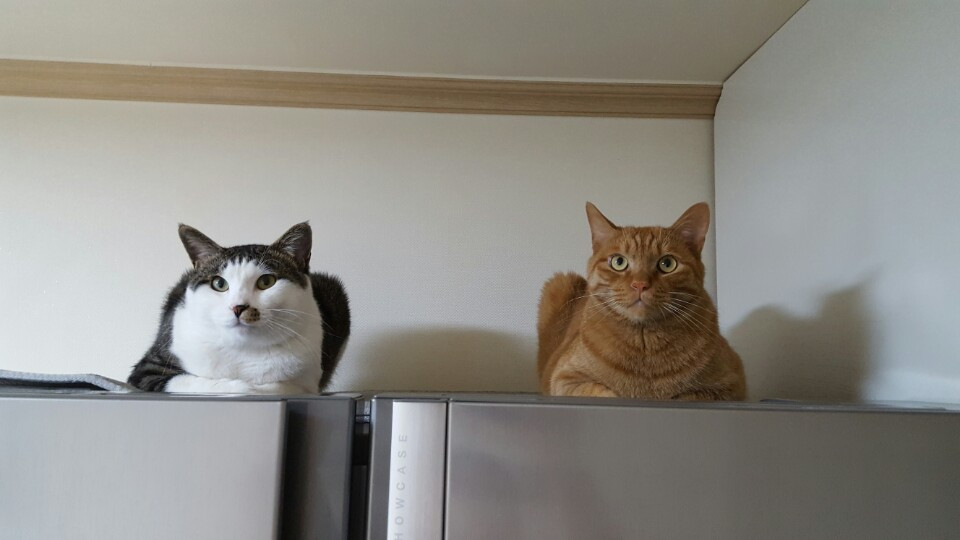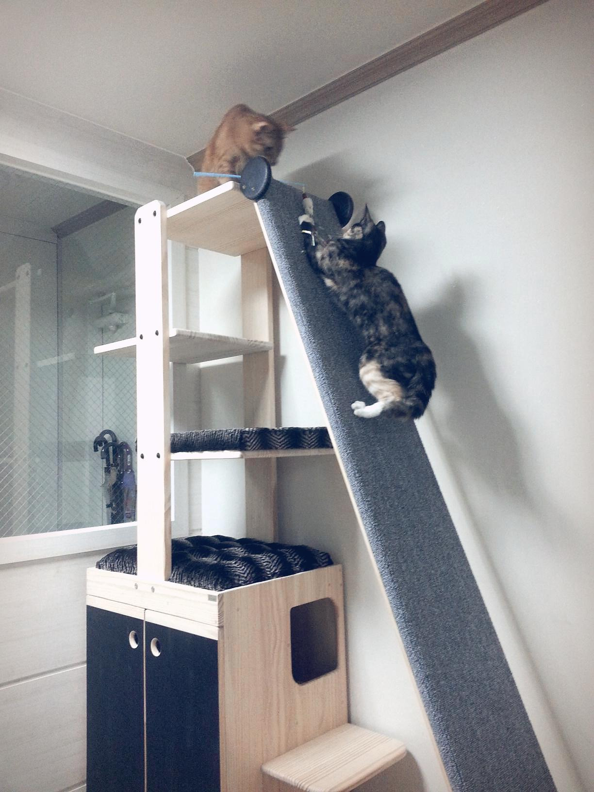 캣타워에서는 냥이들끼리 술래잡기를 하며 놀 수도 있다. 게다가 자연스럽게 운동도 되기 때문에 여건이 된다면 설치해서 나쁠 것은 없다. 높은 곳을 좋아하는 고양이의 특성상, 캣타워는 안정감을 느끼며 휴식을 취할 수 있는 장소가 되기도 한다. 우리처럼 큰 캣타워를 두지 않는 집이라면, 대신 높이 올라갈 수 있는 곳을 몇 군데는 마련해 주는 것이 바람직하다. 냥이에게는 몸을 숨길 수 있는 장소만큼이나 높은 곳에서 조망할 수 있는 장소도 필요하기 때문이다. 아주 지고하신 분들이다. 이때 높은 곳을 쉽게 오갈 수 있도록 그보다 낮은 가구를 옆에 배치해 주면 좋다. 그래야 착지 시의 충격을 감소할 수 있다. 고양이도 관절염에 걸릴 수 있다.
