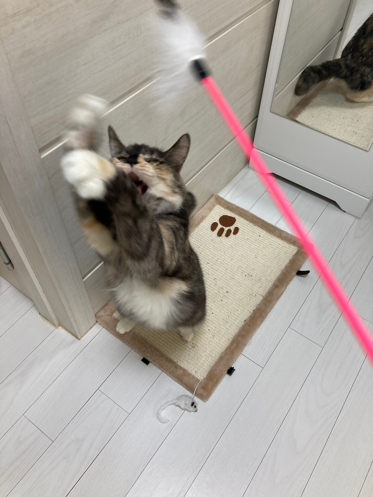 집사도 운동이 된다는 점을 뒤집어 보면 이는 곧 단점이 된다. 힘든 몸을 이끌고 귀가하면 똥간도 비우고, 집안 이리저리 날리는 털도 부지런히 치워야 한다. 체력이 소진되었을 집사들을 위해 쥐돌이를 소개한다. 쥐돌이는 말 그대로 쥐처럼 생긴 작은 인형이다. 금방 시큰둥해지는 단점이 있지만, 소중한 체력을 아낄 수 있다. 고맙게도 막내 루비는 쥐돌이만 던져 줘도 물고 뜯고 맛보며 신나게 논다.