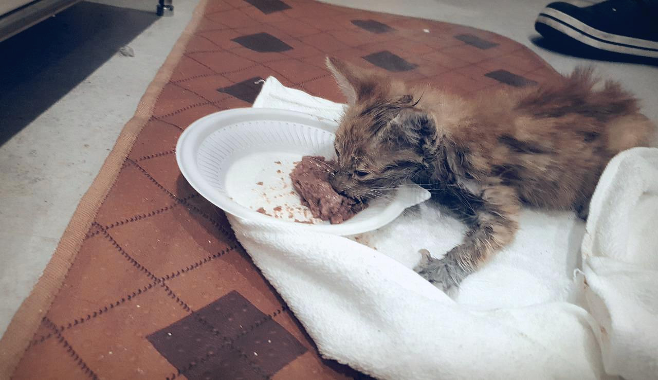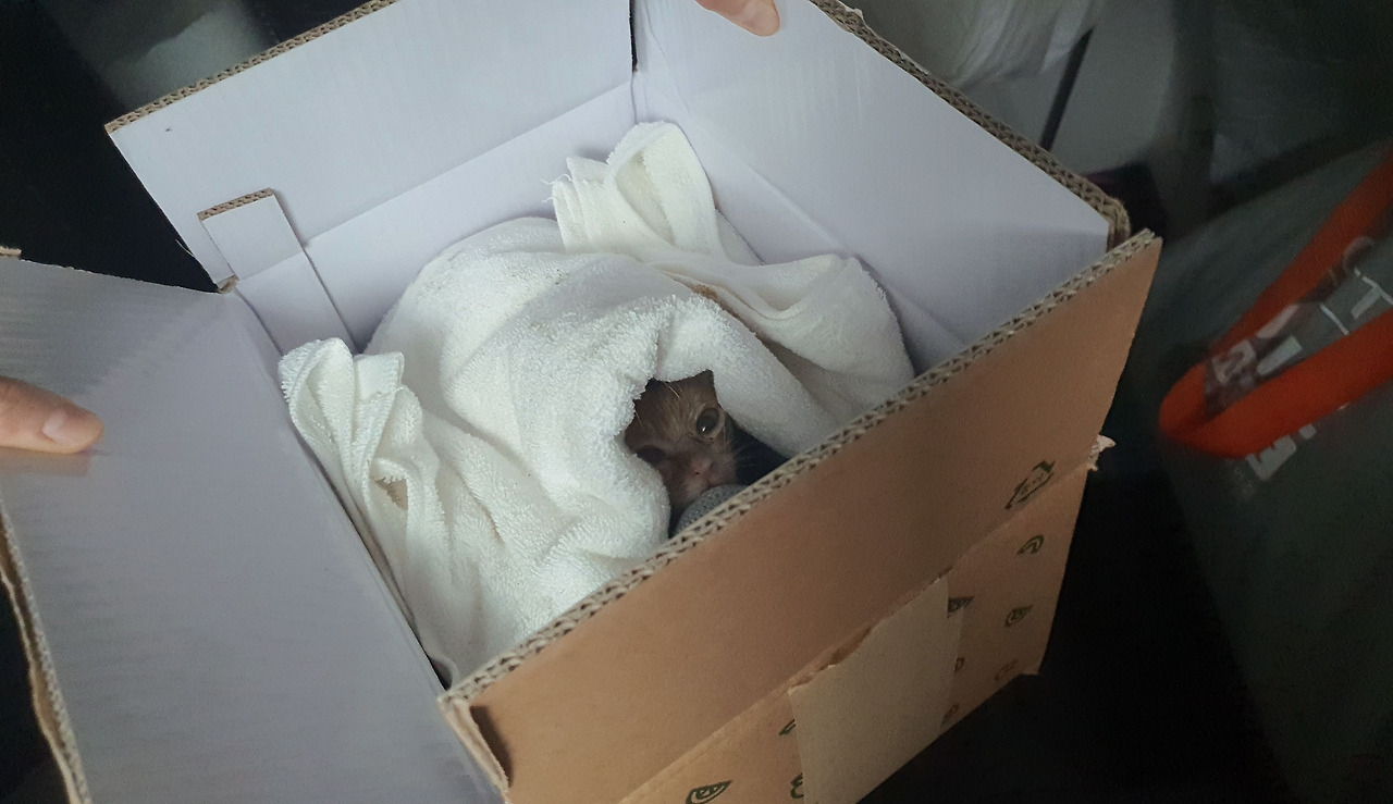 자초지종은 이렇다. 친구의 가게 옆에 누군가 상자를 하나 두고 갔는데 거기에는 아깽이 한 마리가 있었다. 상자를 두고 간 사람에게 물어보니 철조망에 걸려 움직일 수 없는 상태로 비를 쫄딱 맞고 있었다고 한다. 동네를 오가다 봤는데 이곳이라면 길냥이들을 돌볼 수 있을 것 같아 어쩔 수 없이 두고 간다고 했다.