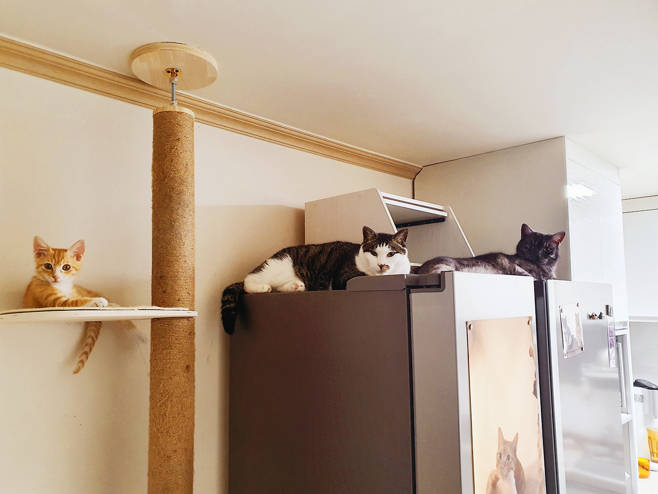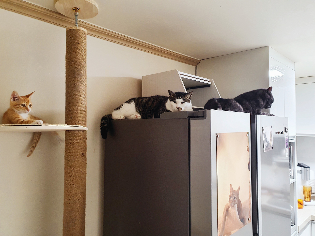 4냥이들이 더위를 피해 냉장고에 모여 있다. 더울 거라는 예상과 달리 냉장고 위는 의외로 시원하다. 본묘의 요청에 따라 츠동이는 사진으로만 출연한다.