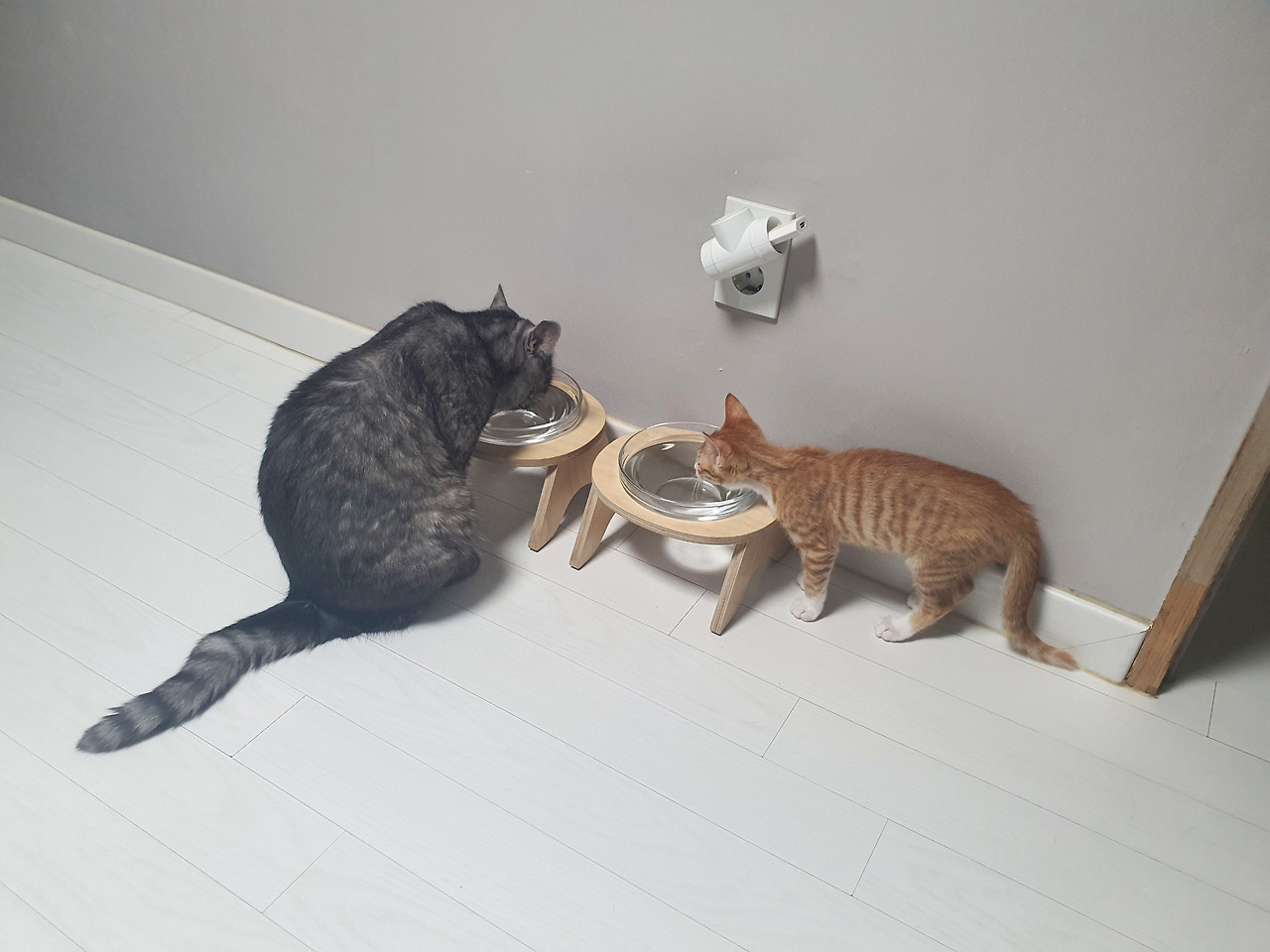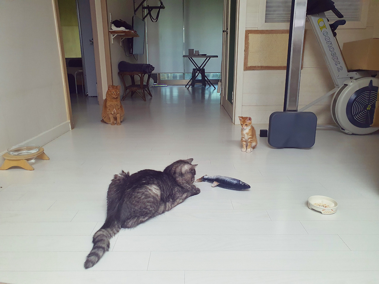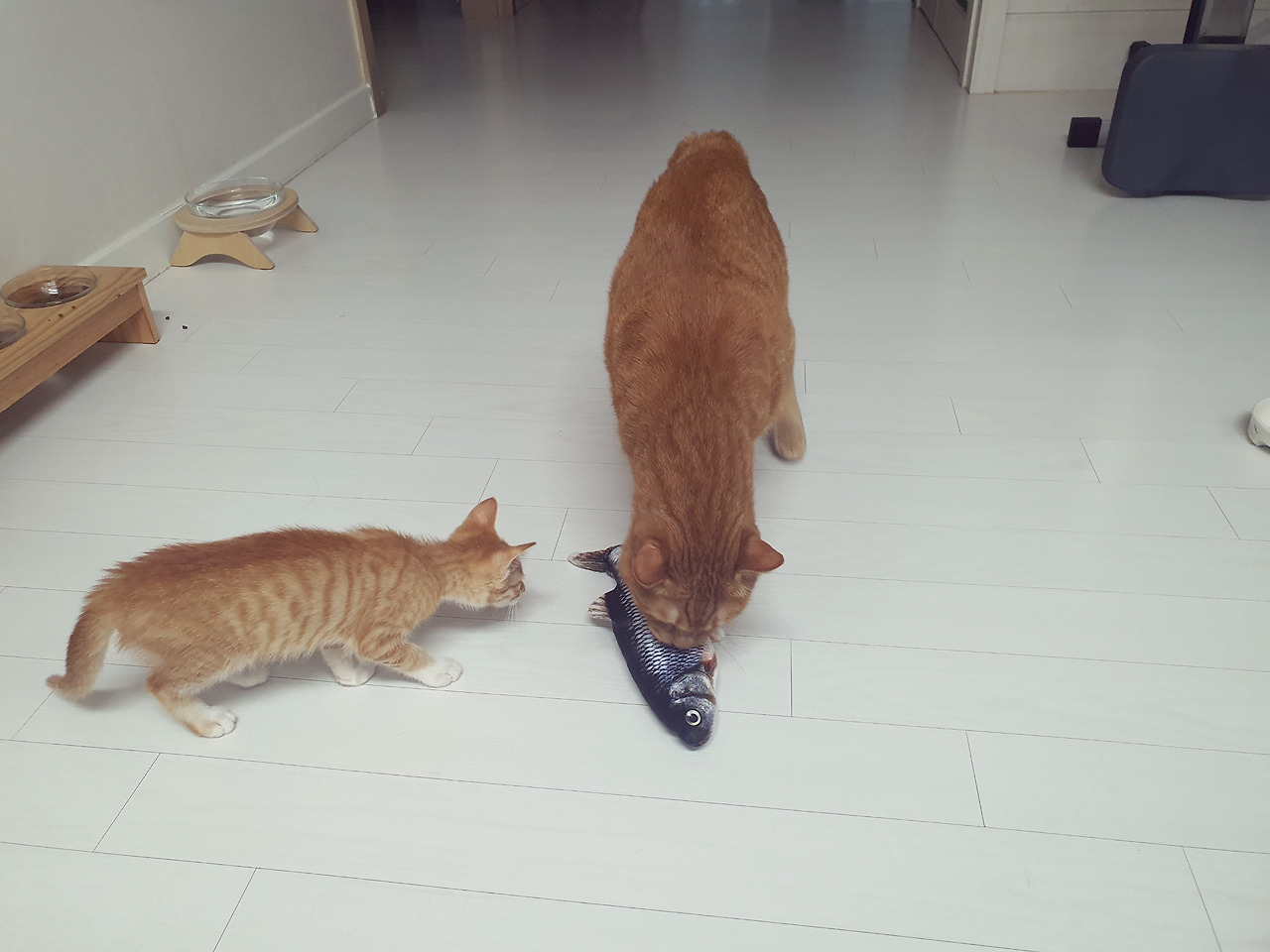 "여름에 날생선 잘못 먹으면 큰일난다. 기다려. 괜찮은지 형아가 먼저 먹어 볼게." 캣닢 생선을 독차지하게 위해 동생들에게 사기를 치는 츠동이.
