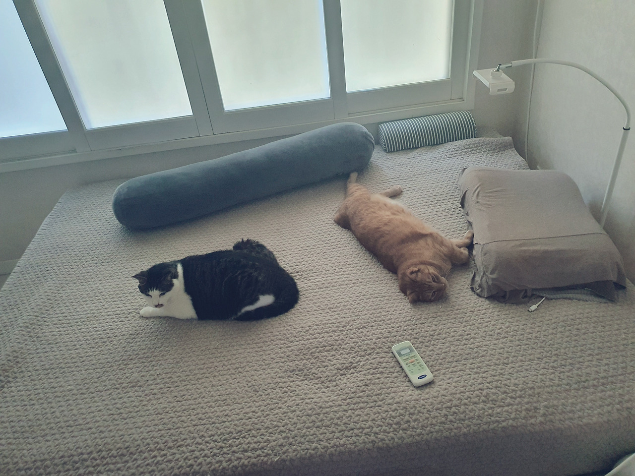 아빠처럼 다정한 사람이 되는 일은 올해도 글렀다. 내 몸 하나 챙기기도 쉽지 않다. 그래도 한 가지는 다행이다. 손가락만 까딱 하면 서늘한 바람이 쌩쌩 나오는 시절을 살고 있으니 말이다. 게으른 고양이들 옆에 같이 자빠져 팔베개 정도는 해 줄 수 있을 것 같다. 부지런히 기록을 남기는 일만큼은 미루지 말아야겠다.