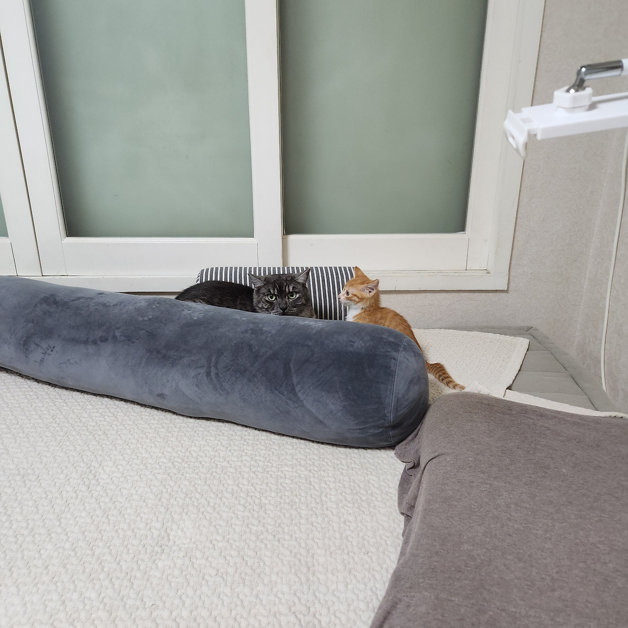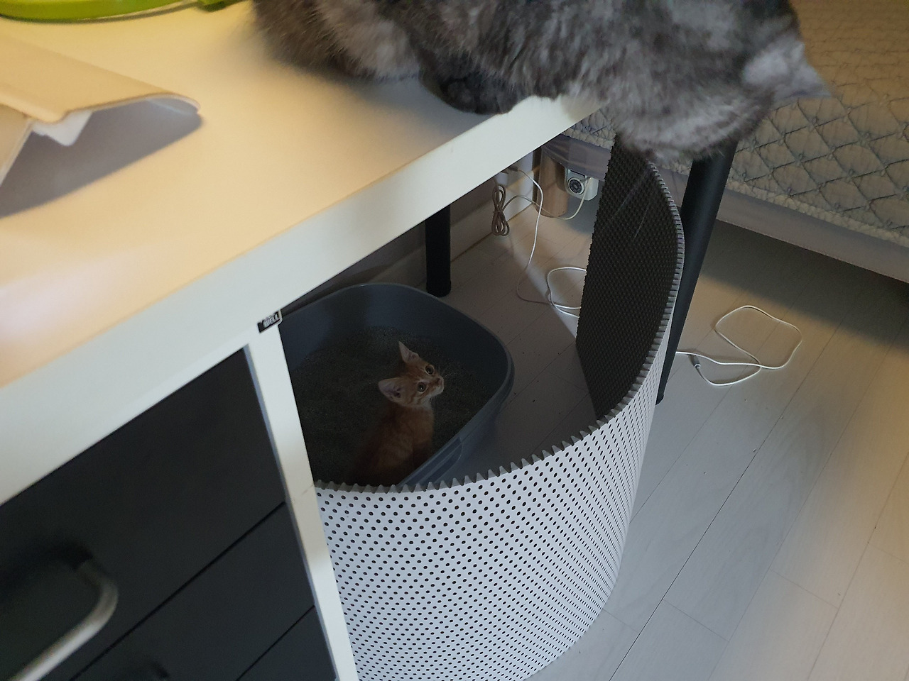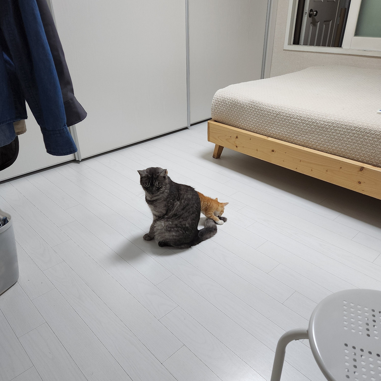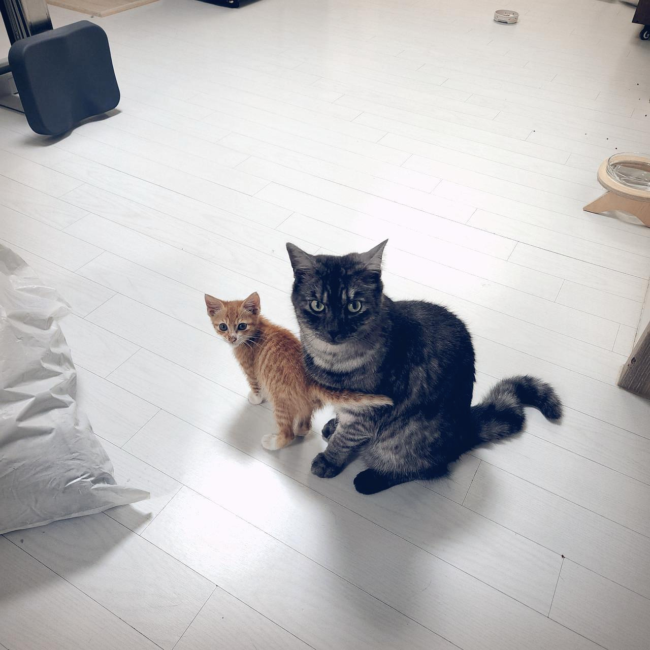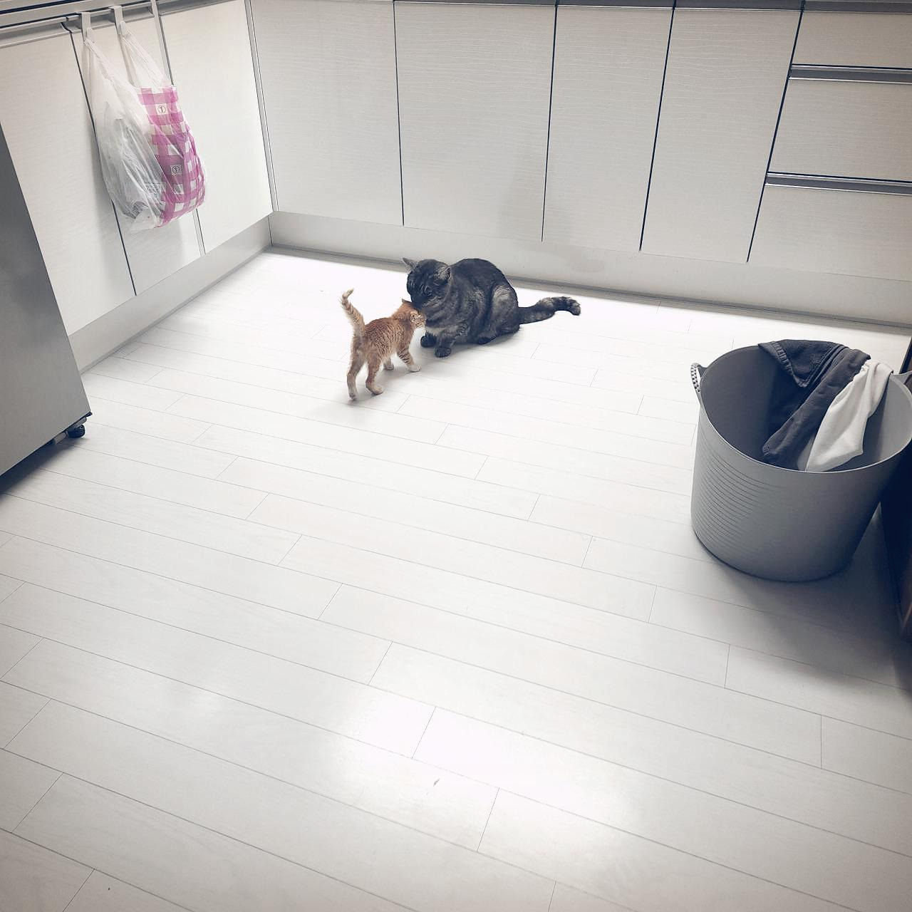 그런데 츠동이와 구로의 얘기도 좀 들어 봐야 한다. 루비와 사정이 좀 다르다. 작은 꼬물이가 성가시면 얼마나 성가시다고 요 까칠이들이 냉장고와 캣타워 위에서 내려올 생각을 하지 않는다. 께동이를 격리하면 귀신 같이 알고는 그제야 방을 돌아다닌다. 안 내려오는 건 자유지만 밥이랑 물은 제때 먹고 있는지 걱정이 된다. 더 친해질 수 있도록 뭔가 조치가 필요했다.