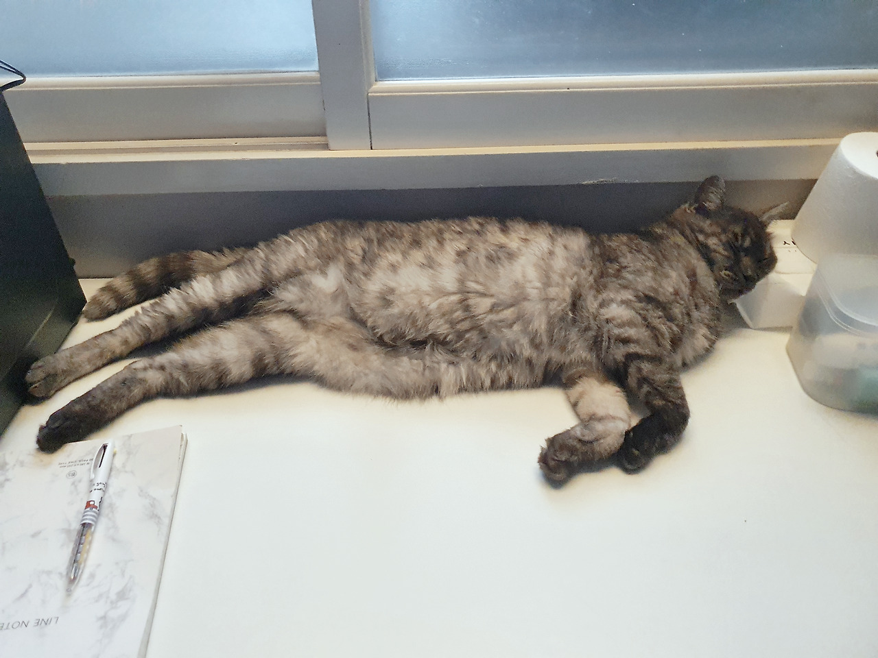 이 녀석들은 생각보다 많이 잔다. 집사의 생활 리듬에 맞추어 야행성 본능을 포기했을 뿐, 낮에는 좀 활발히 움직일 줄 알았다. 아니다. 낮에도 잔다. 침대에서도 자고, 냉장고 위에서도 자고, 작은 몸을 누일 수 있는 곳이라면 어디든 상관없다. 술에 취해 집 앞 공원 벤치에서 밤하늘을 지붕 삼아 한 숨 때리던 대학생 시절이 떠올랐다.