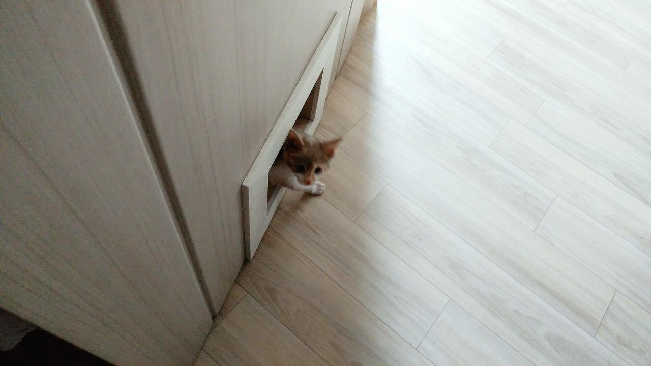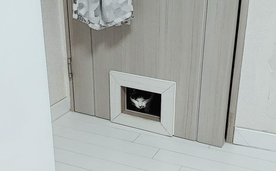 문을 닫아도 냥이들이 안방을 언제든지 출입할 수 있도록 작은 구멍을 내었다. 문짝을 떼어 낸 후 작업을 해야 하기 때문에 중문과 마찬가지로 그렇게 쉬운 일은 아니다. 원래는 플라스틱 문도 달려 있었으나, 소리가 시끄러워 떼어 버렸다.