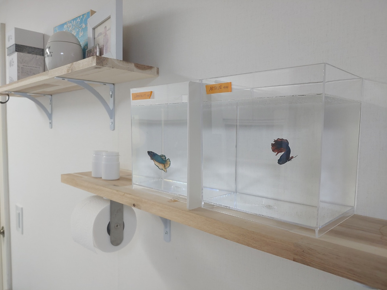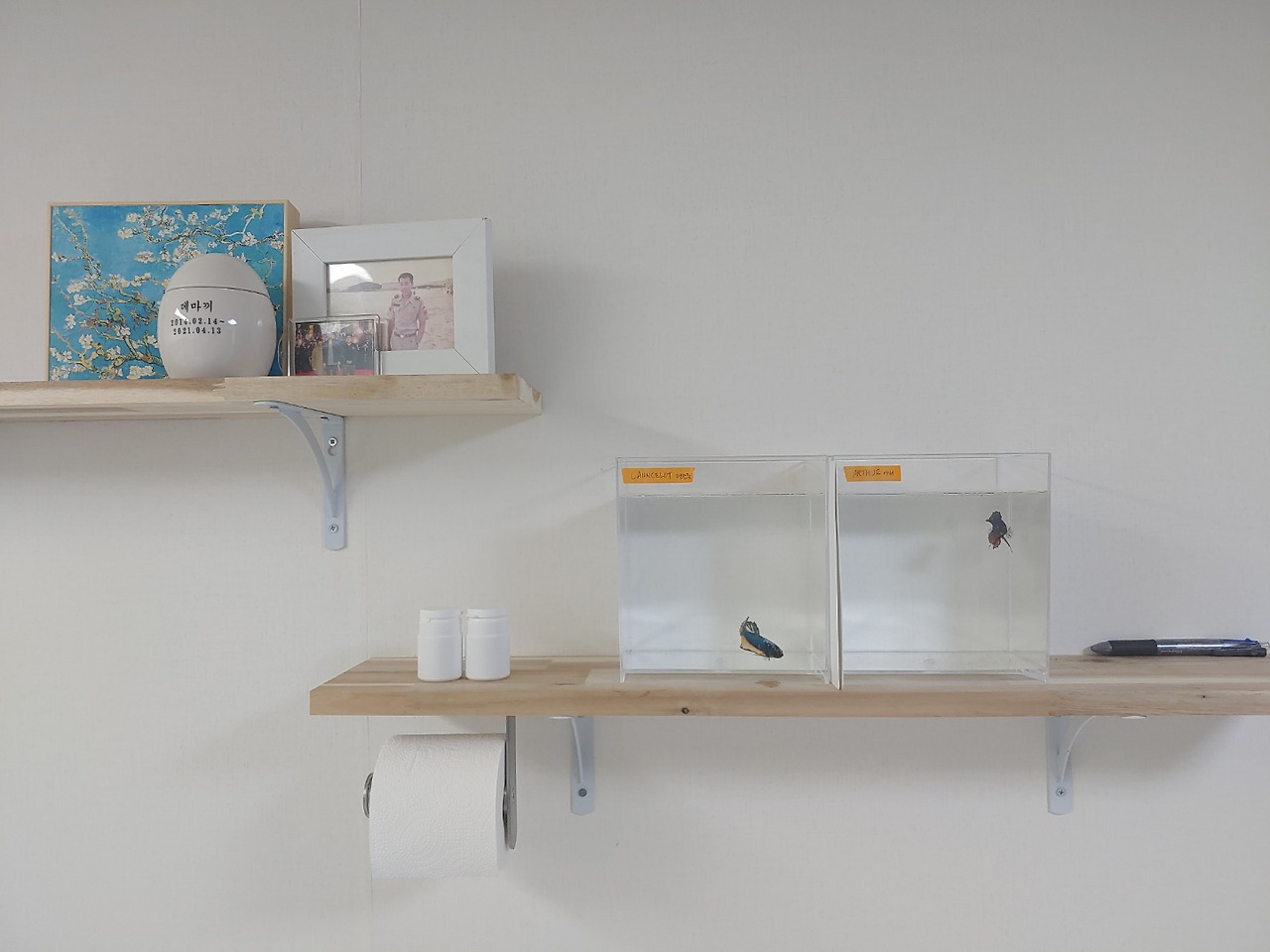 | 깔끔한 벽결이 선반 | 수납과 인테리어 두 마리 토끼 잡기. 거실 선반에는 먼저 떠난 마끼, 그리고 물고기 친구들인 랜슬롯과 아서가 쉬고 있다.