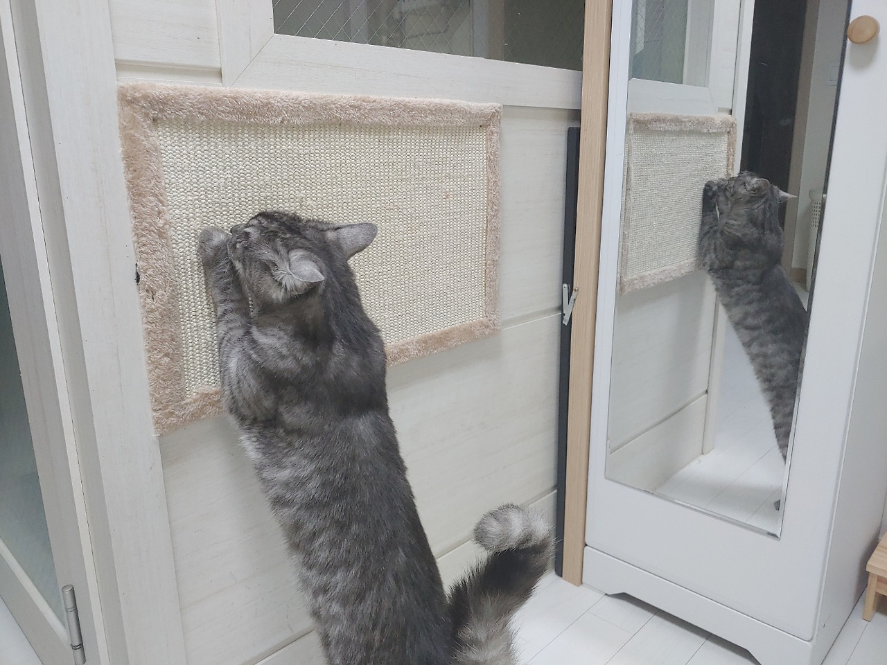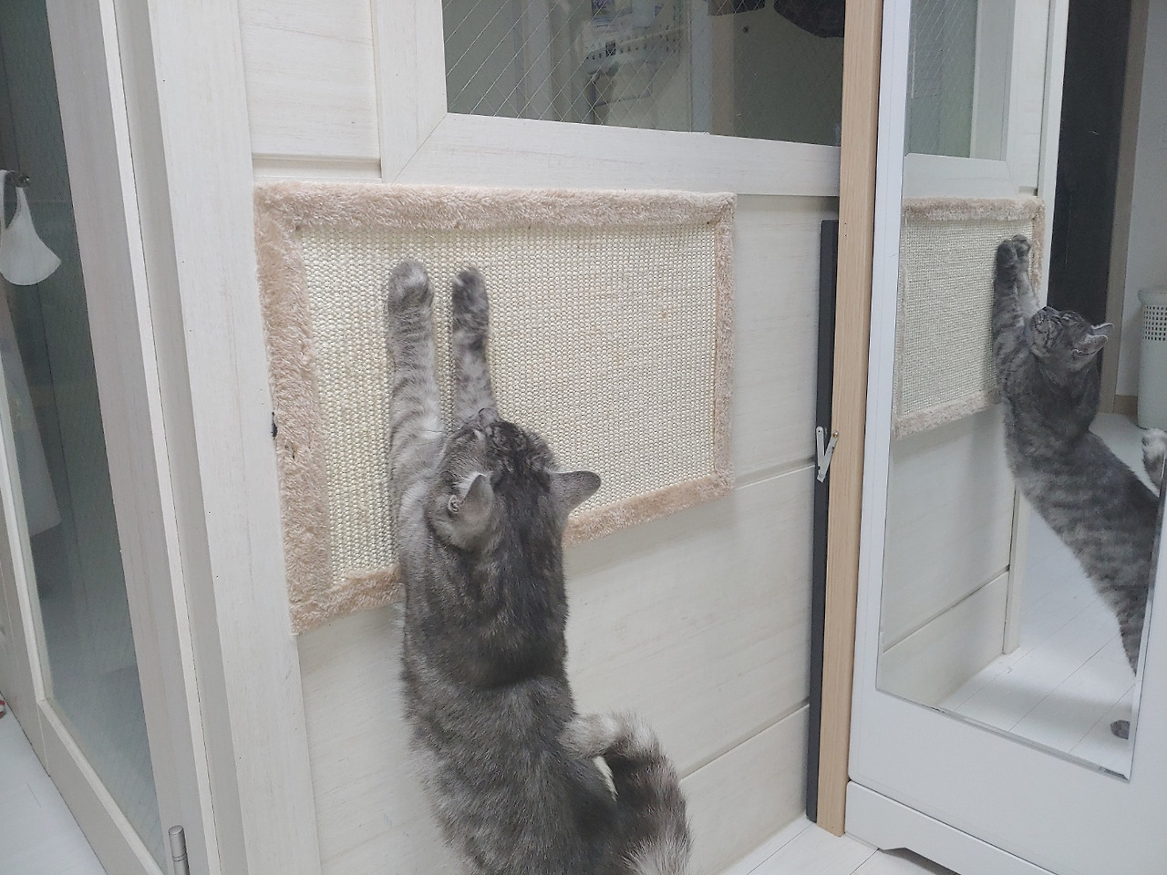 바닥에 두고 사용하는 스크래칭 매트를 중문 옆 벽에 붙여 보았다. 바닥에 두고 사용할 때보다 보기가 좋다. 무엇보다 매트가 냥이들에게 치여 이리저리 굴러다니지 않아 청소할 때 굉장히 편리하다. 이미 기둥형 스크래처가 있어 하나를 더 두기에는 부담스럽다면 스크래칭 매트를 벽에 부착해 보자.
