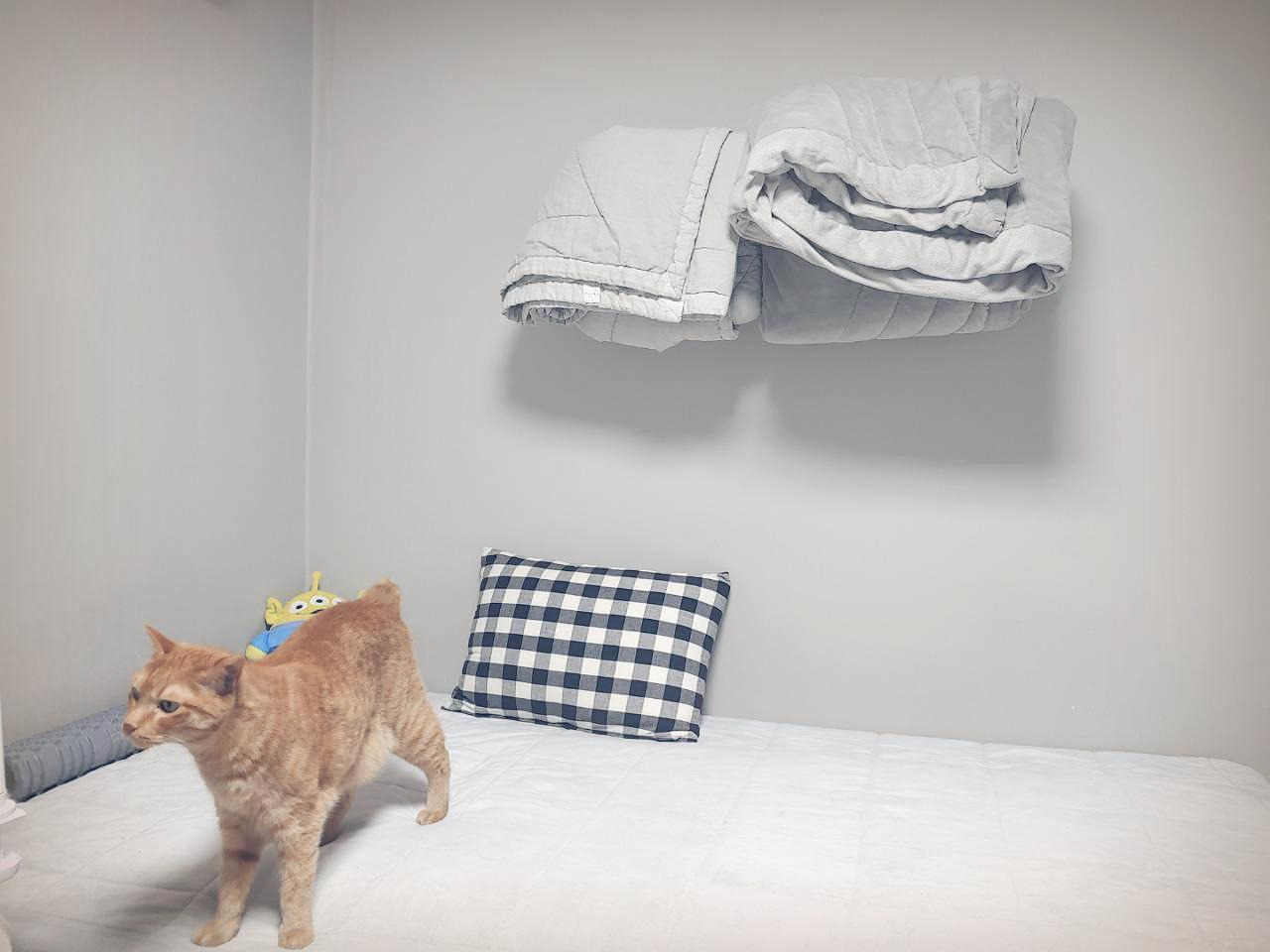 원래는 이불을 장에 따로 넣지 않고 침대 머리맡에 잘 개어 두기만 했었다. 그런데 출근한 사이 냥이 녀석들이 자꾸 이불을 헤집고 들어가는 바람에 이불 걸이용 행거를 설치하게 되었다. 흐트러지는 것은 상관없으나 털이 너무 붙었다. 주로 츠동이가 많이 들어가는데 하필이면 털이 제일 많이 빠지는 녀석이다. 행거를 설치한 후 이불을 덮을 때 얼굴에 붙는 털이 굉장히 줄어들었다. 생각보다 미관이 흉측하지 않아 벽에 구멍을 뚫어도 좋다면 추천하는 방법이다.