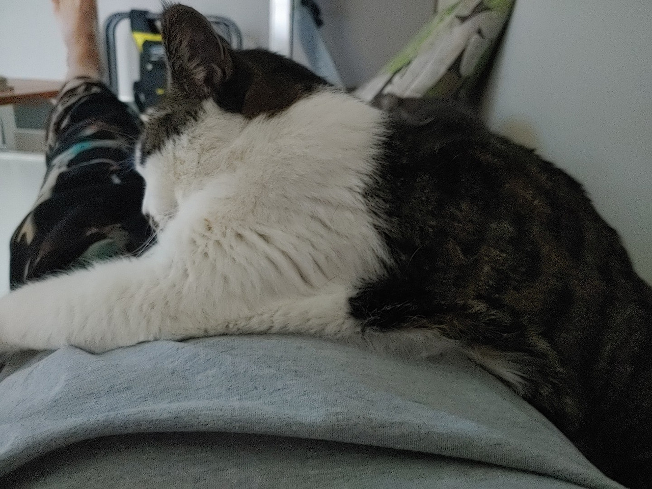 처음엔 커가면서 사람을 피하는 성향이 없어질 것이라 생각했다. 안타깝게 성묘가 된 지금도 여전히 서 있는 상태에서는 2미터 안으로 접근할 수 없다. 나는 매일 집에서 보는 형이라고 1.5미터까지, 아내는 1미터까지는 허용한다. 이 0.5미터의 차이가 은근히 섭섭하다. 구로에게는 사료를 주는 횟수마다 접근 허용 거리를 조금씩 차감하는 마일리지가 있기라도 한 것일까. 아무래도 키가 더 큰 사람을 무서워하기 때문이라고 생각하는 편이 좋겠다. 요새는 앉거나 누워 있을 때는 꽤 가까이 오기도 하는데 조금이라도 움직이면 다시 호다닥 도망갈 때가 많다.