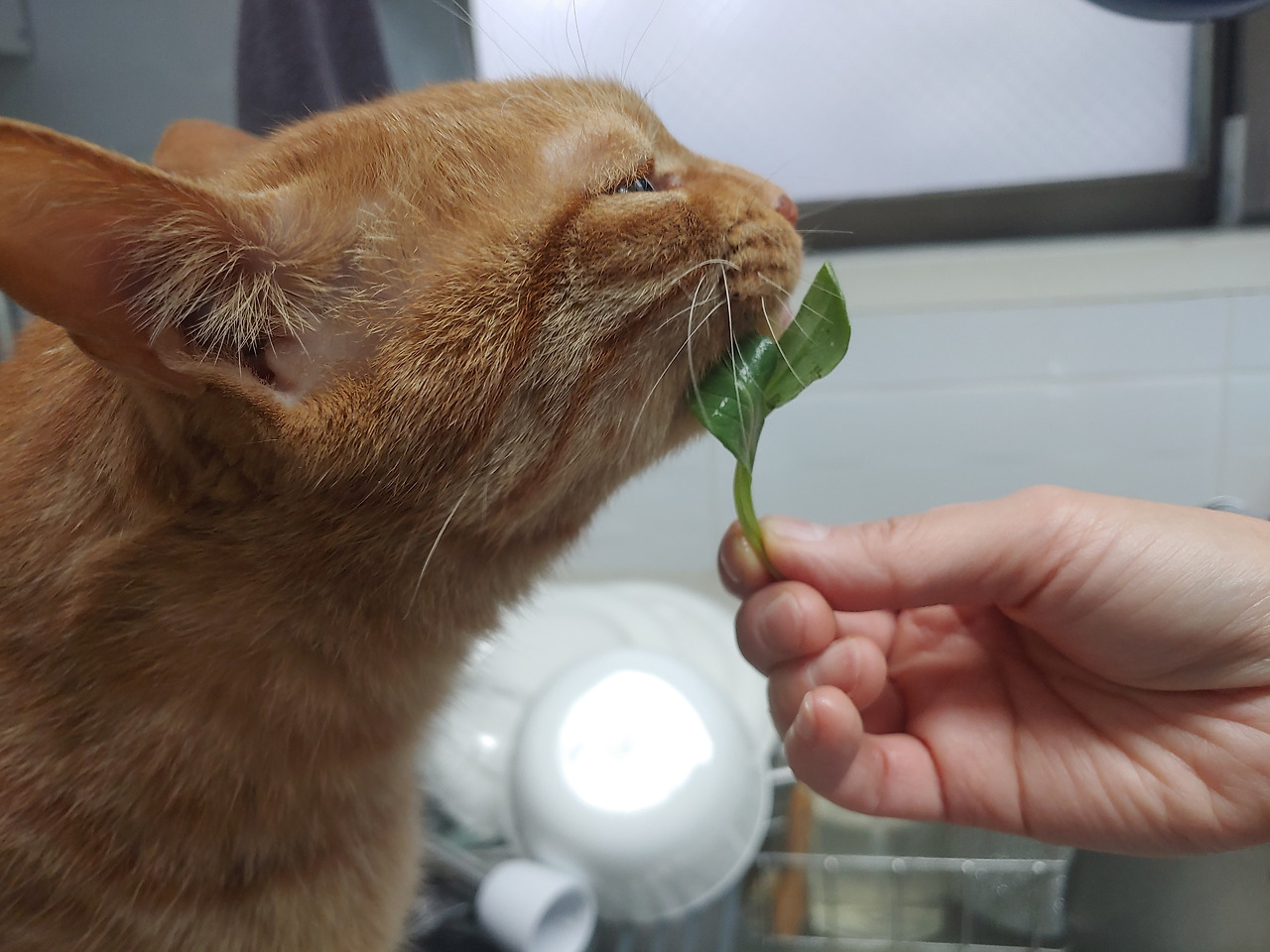 회에 꽂힌 마끼. 빈 접시를 보고 나라 잃은 표정이 되었다. 우리 집에서 마끼만 유일하게 날것을 좋아한다.