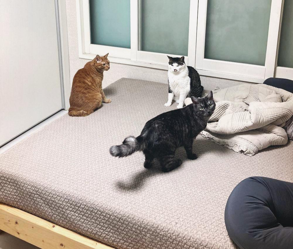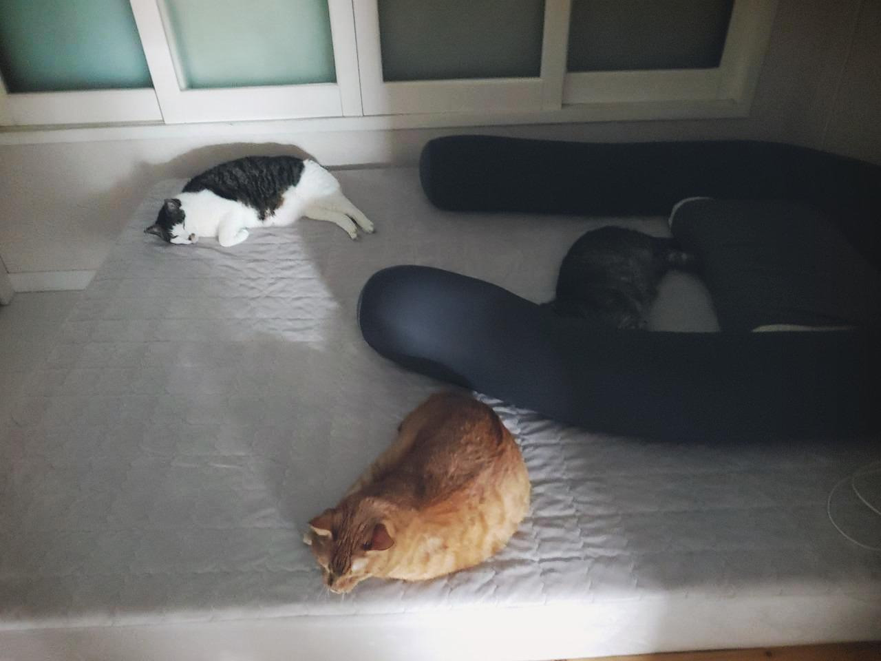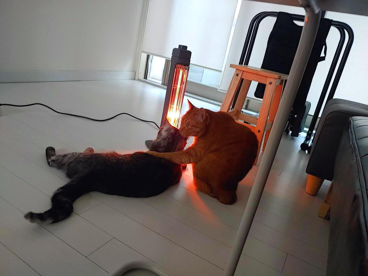 자리를 내어 주지 않는 야속한 고양이들. 엉덩이로 밀어 내야 그제야 불만 가득한 ‘야옹’ 소리를 내며 움직인다.