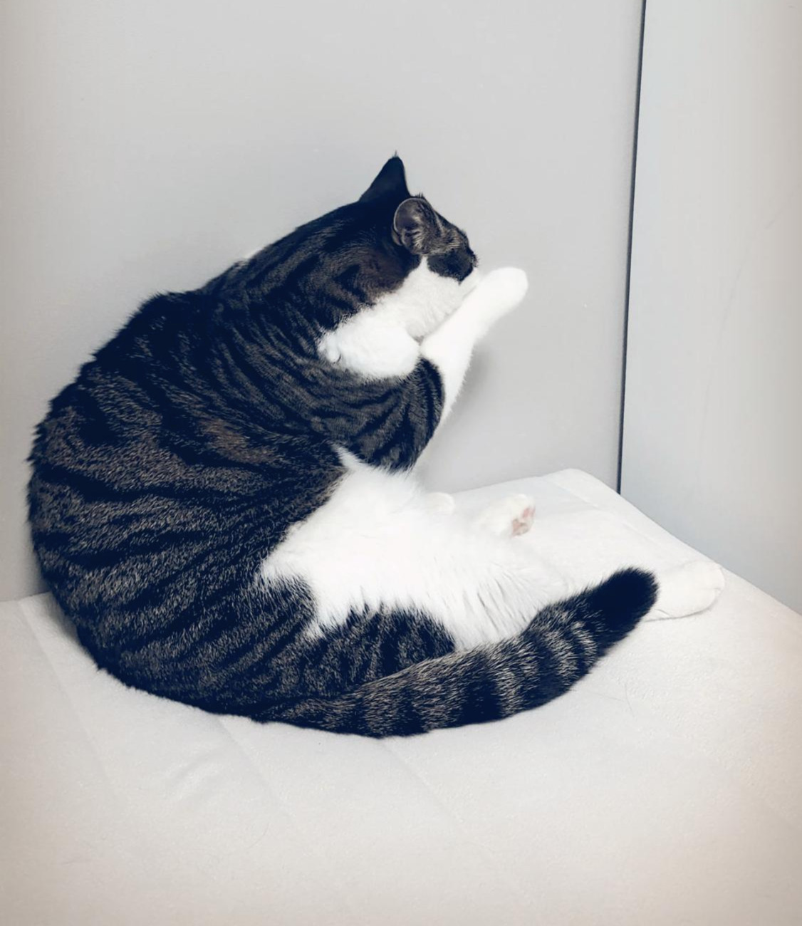 뚱냥이 중에서는 제일 날씬한 우리 구로는 저 귀여운 뱃살을 가득 접고도 그루밍을 곧잘 한다. 그런데 도대체 왜...?