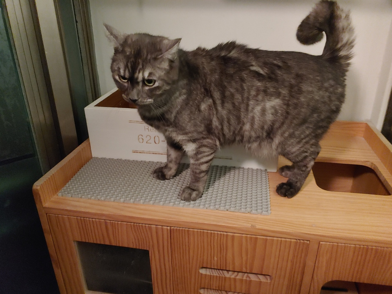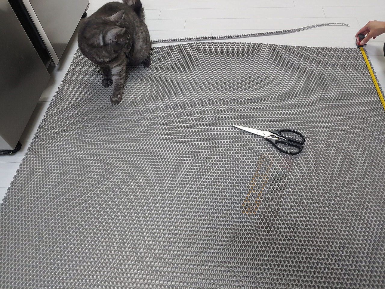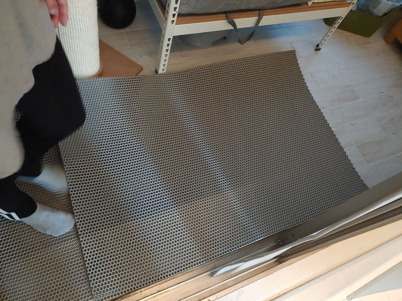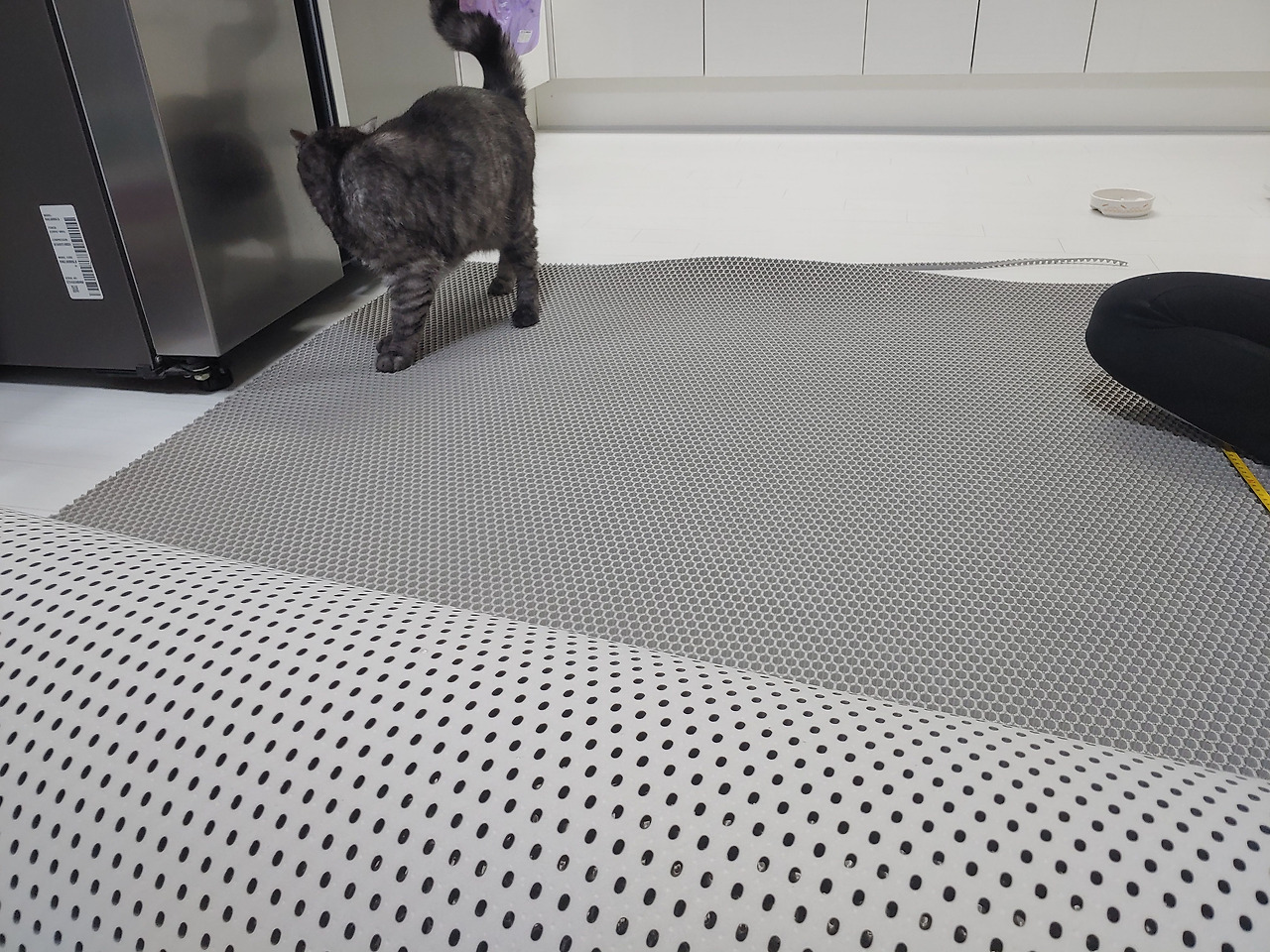 그래서 깔았다! 사막화 방지 매트! 역시 이번에도 아내의 아이디어이다. 실제로 깔아 보니 아주 기특한 녀석이다. 건방진 냥이 녀석들이 혹시라도 발에 모래를 묻히고 나와도, 매트 위를 걷는 과정에서 모래가 떨어지게 된다. 떨어진 모래는 매트에 숭숭 뚫린 구멍들 사이로 빠지게 되니, 한 달에 한 번 정도 매트를 들어내고 청소기만 돌려주면 될 일이다. 매트 위에 토를 하면 어떻게 치울지 걱정되기는 하지만, 그건 그때 생각하자.