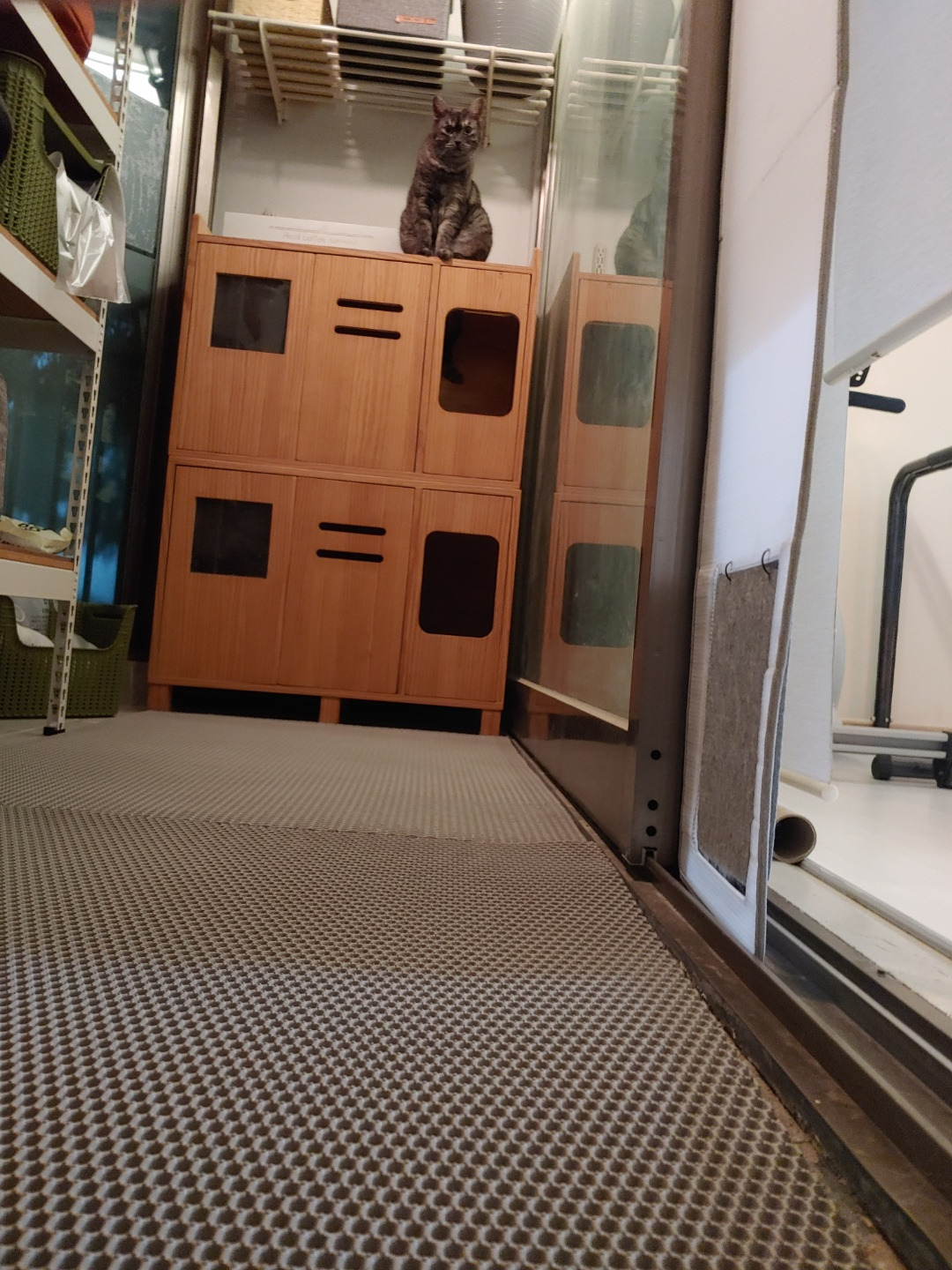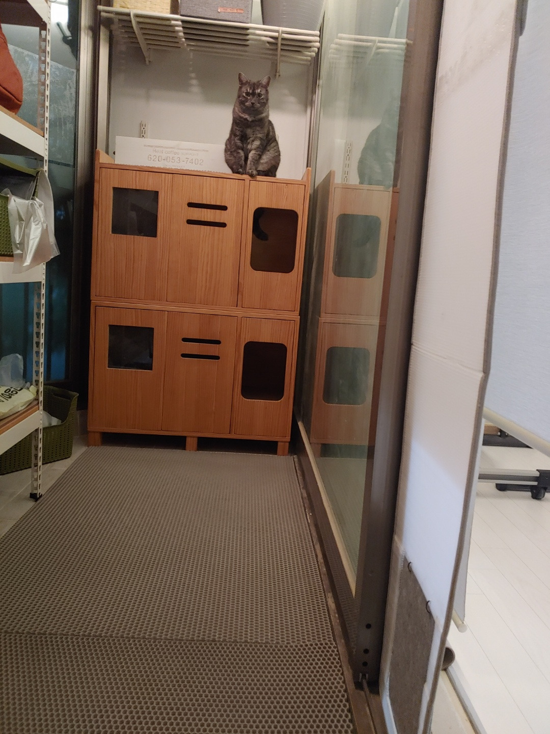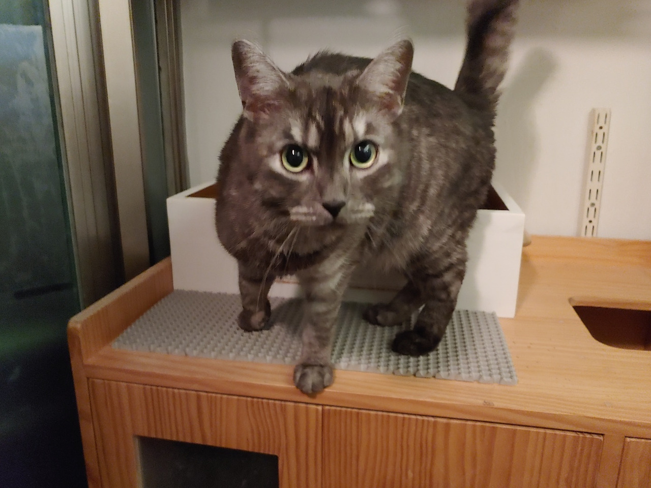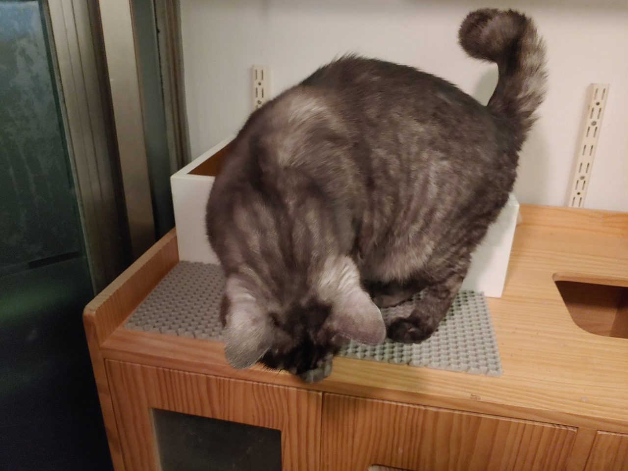 그래서 깔았다! 사막화 방지 매트! 역시 이번에도 아내의 아이디어이다. 실제로 깔아 보니 아주 기특한 녀석이다. 건방진 냥이 녀석들이 혹시라도 발에 모래를 묻히고 나와도, 매트 위를 걷는 과정에서 모래가 떨어지게 된다. 떨어진 모래는 매트에 숭숭 뚫린 구멍들 사이로 빠지게 되니, 한 달에 한 번 정도 매트를 들어내고 청소기만 돌려주면 될 일이다. 매트 위에 토를 하면 어떻게 치울지 걱정되기는 하지만, 그건 그때 생각하자.