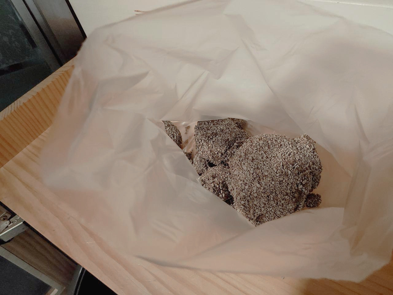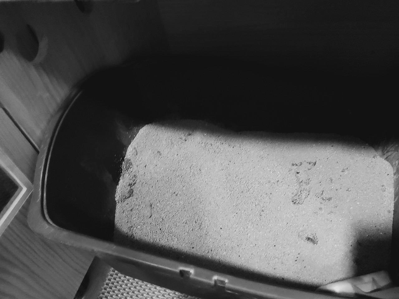똥스키 테러 후 부끄러움에 낯을 들지 못하는 구로. 실리카겔 모래는 장점에 비해 단점이 커서 유일하게 사용해 보지 않은 모래이다.