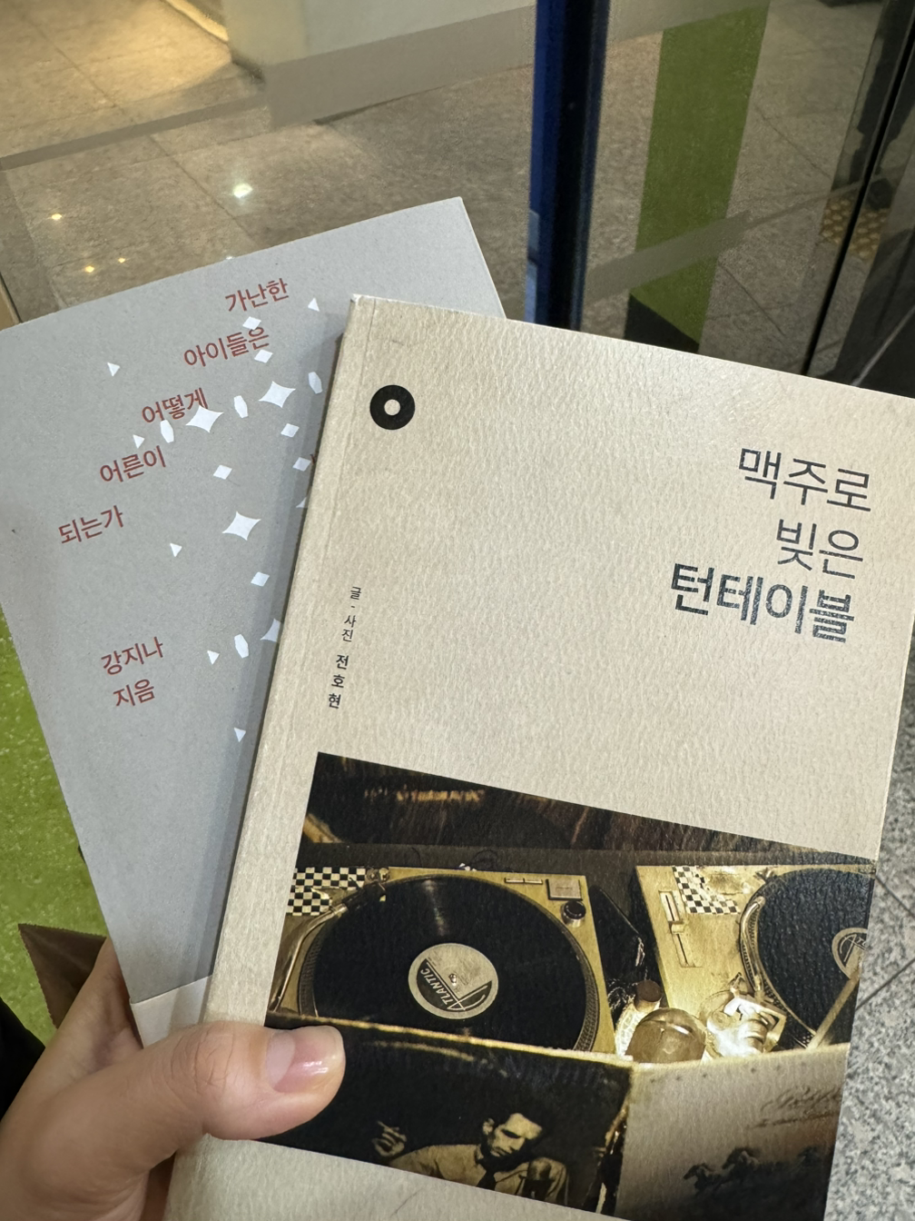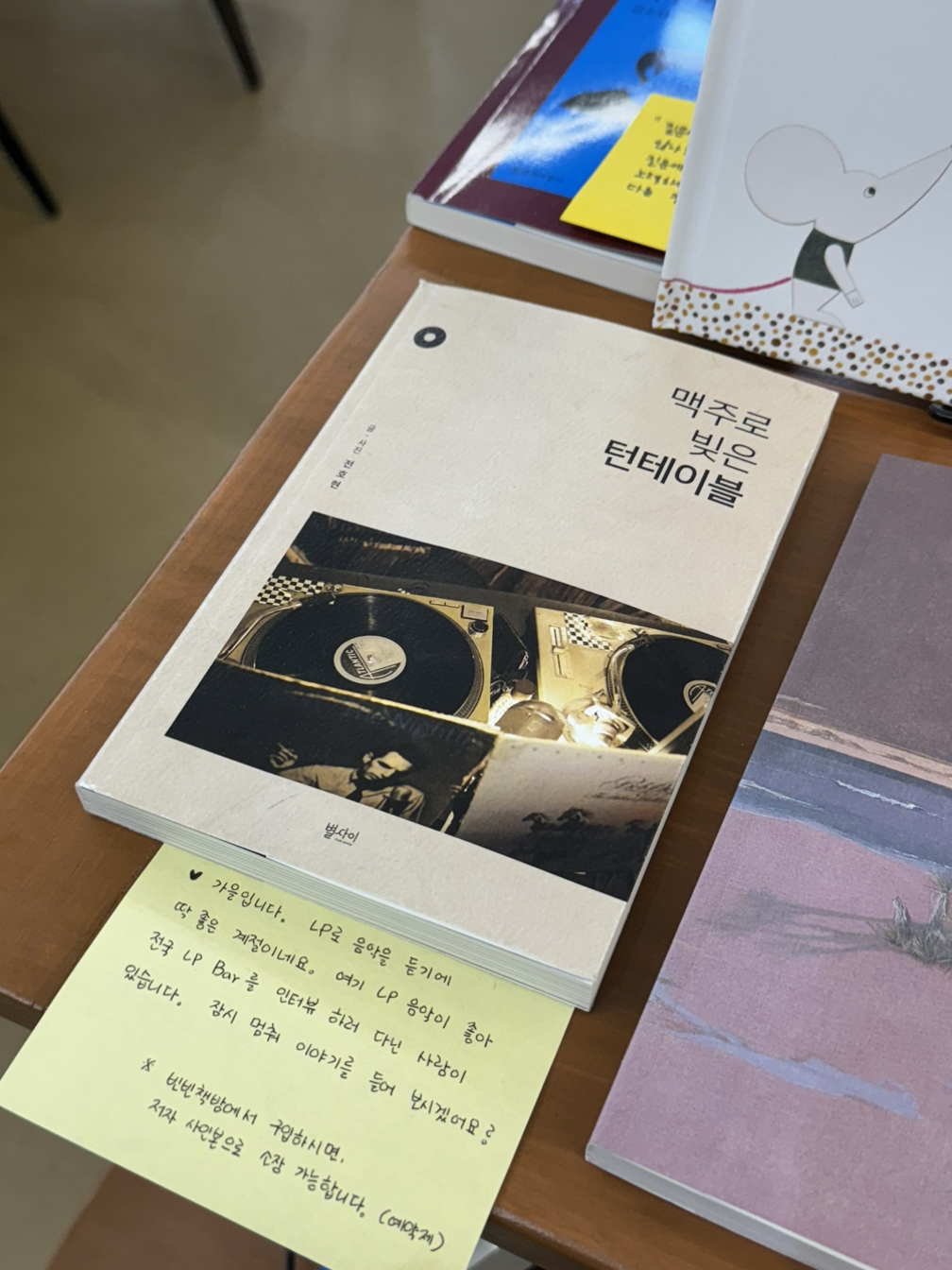 고심 끝에 데려온 두 권의 책이다. '맥주로 빚은 턴테이블'은 이미 다 읽었고, '가난한 아이들은 어떻게 어른이 되는가'는 현재 읽고 있는 책이다. '맥주로 밎은 턴테이블' 같은 경우에는 교보문고에 가서 책을 골랐다면 아마 구매까지 이어지지는 않았을 것 같은 책이다. 독립 서점이었기에 좀 더 눈길이 갔고 아까 위에서 말했듯 붙어있던 작은 포스트잍의 큰 역할이 이런 것이다.