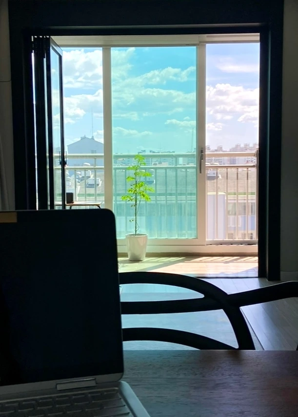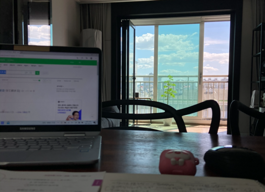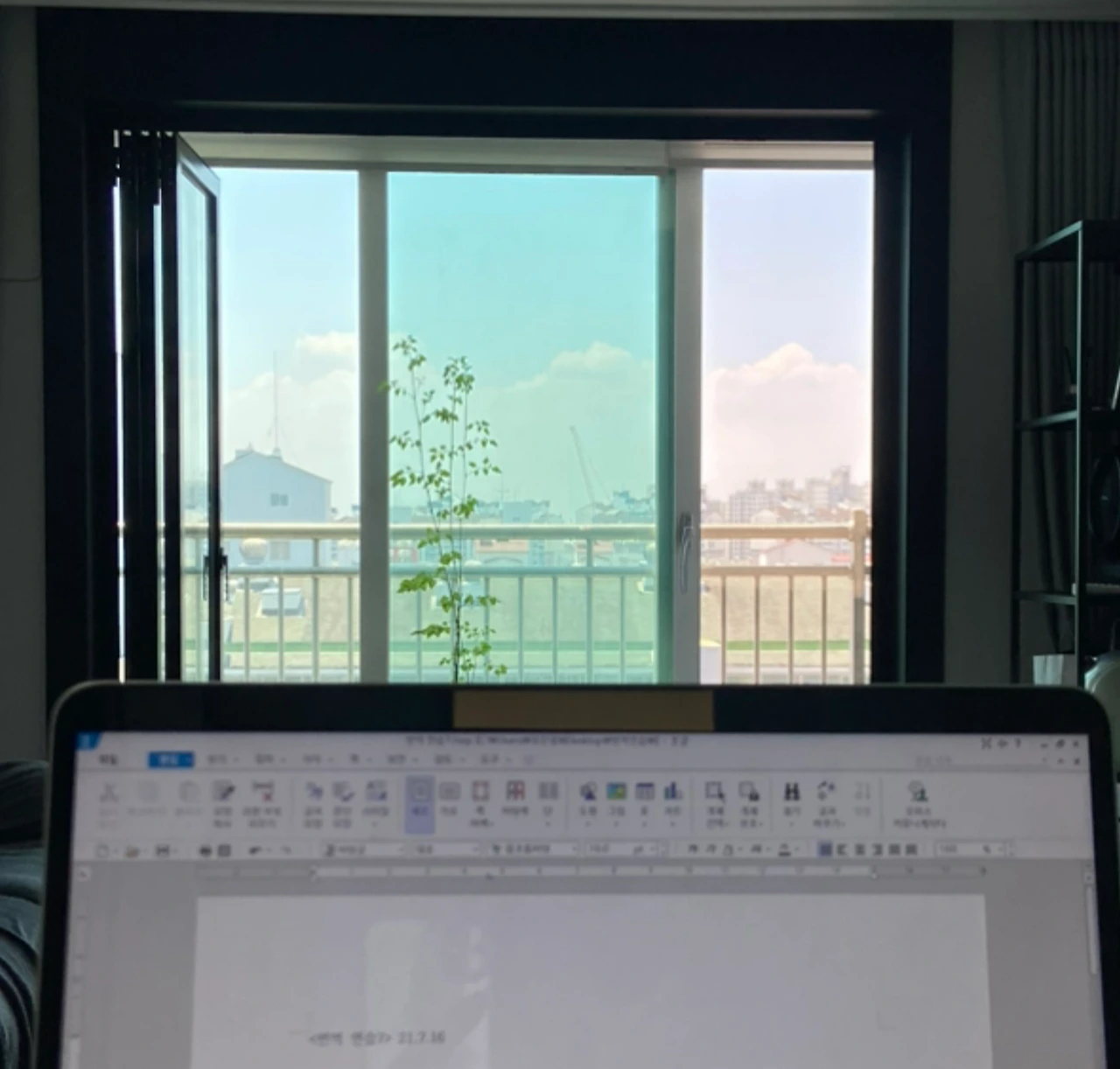이 공간에서 나는 책도 읽고, 글도 쓰고, 공부도 하며 시간을 보낸다. 날씨가 위에 사진과 같이 좋은 날에는 멍하니 하늘을 보며 힐링도 한다. 집에 아무도 없는 날, 좋아하는 LP를 틀어 놓고 책을 읽거나 글을 쓰고 있으면 뭔가 더 집중도 되고 없던 창의력도 마구 발동되는 기분이다. 나만의 프라이빗한 공간까지는 못 되지만 다행히 같이 사는 우리 집 두 남자들에게 이 공간은 그렇게 매력적이지 않은 듯하다.