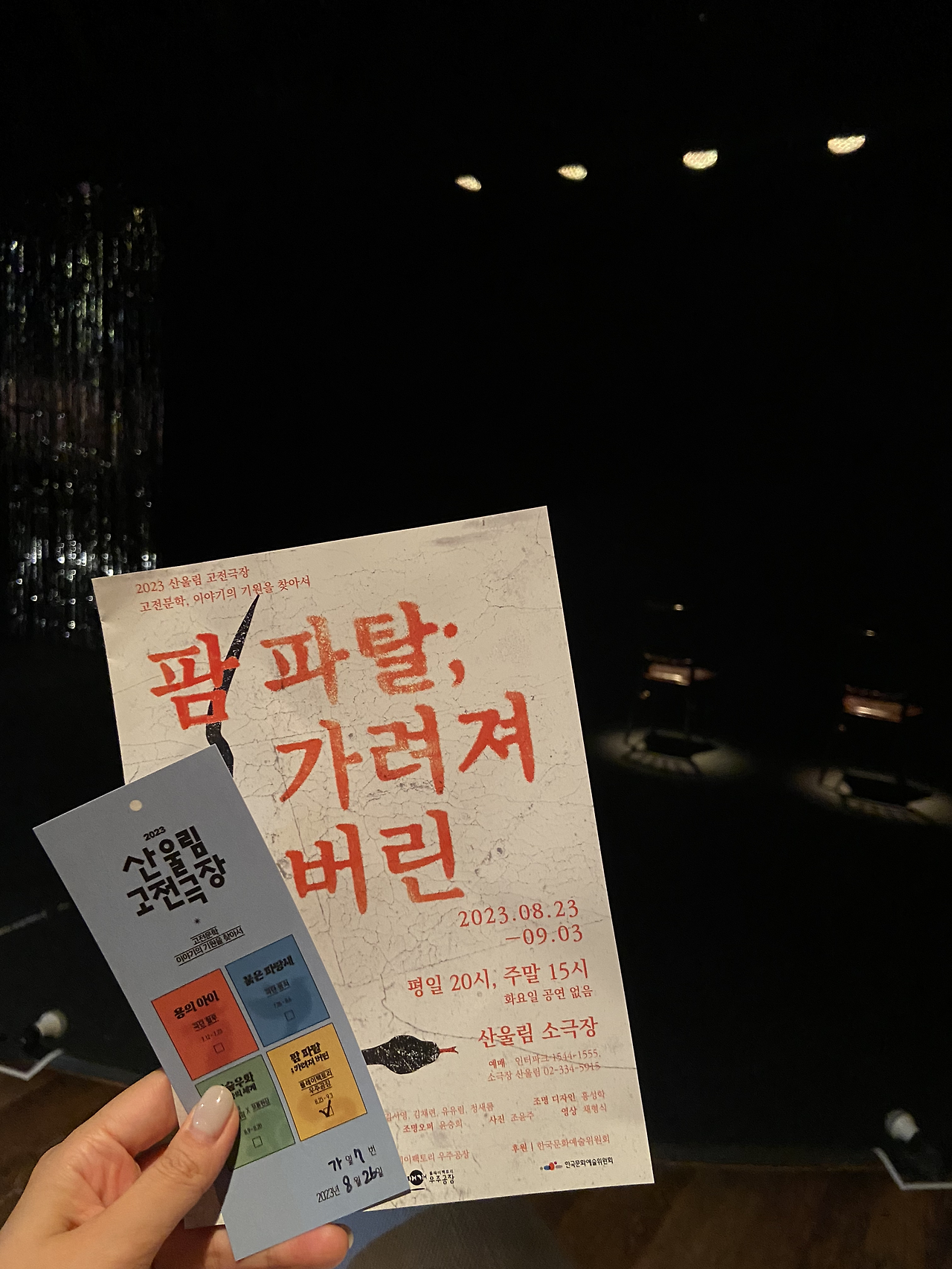 두 편의 공연 모두 러닝타임이 2시간 정도였다. 솔직히 친구가 출연하는 공연이라고 해서 무조건적으로 재밌다고 하는 것이 아니라, 진짜로 두 편 모두 재미있었고, 시간 가는 줄 모르고 공연에 집중해서 보았다. 첫 번째 공연은 아이디어와 배우들의 에너지가 돋보이는 작품이었고, 두 번째 공연은 역시 대학 공연답게 실험적이고 신선한데 재미까지 더한 작품이었다. 하지만 안타깝게도 두 공연은 모두 이미 종료되었다. 주변에 추천을 하거나 나라도 다시 한번 보고 싶은 공연인데 아쉽다.