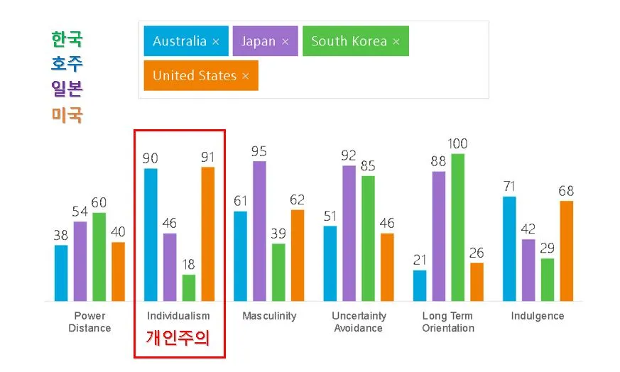 한국의 개인주의 지수는 18로 하위권에 속하며, 심지어 같은 동양권 국가인 일본보다도 훨씬 낮다.
