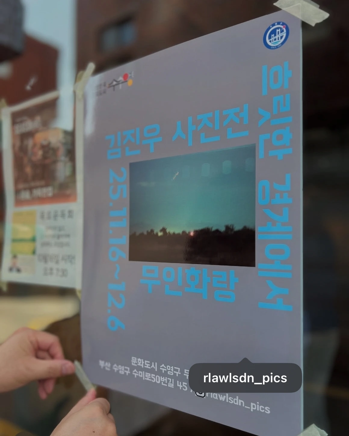 개인전 포스터를 윤슬에 부착하고,