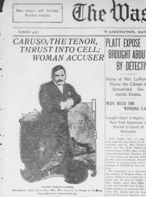 “메트로폴리탄 오페라 하우스의 스타, 엔리코 카루소(Enrico Caruso, 당시 33세)가 센트럴 파크 동물원에서 젊은 여성 간호사를 희롱한 혐의로 체포되었다.”