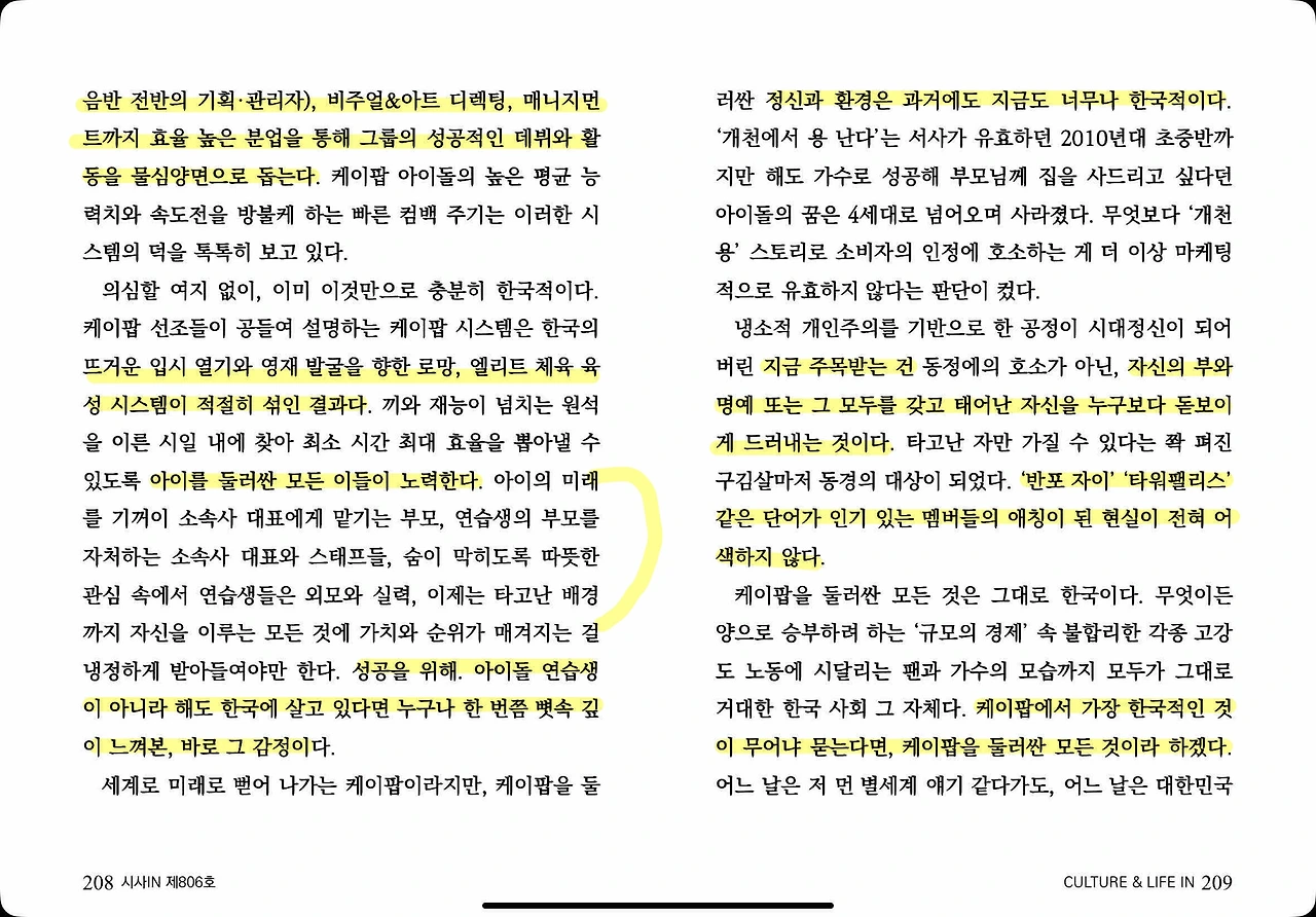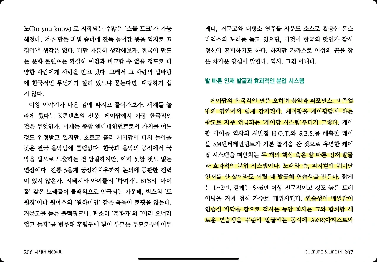 케이팝의 한국적인 면은 오히려 음악과 퍼포먼스, 비주얼 밖의 영역에서 쉽게 감지된다. 케이팝을 케이팝답게 하는 왕도로 자주 언급되는 ‘케이팝 시스템’부터가 그렇다. 케이팝 시스템을 떠받치는 두 개의 핵심 축은 발 빠른 인재 발굴과 효과적인 분업 시스템이다. 노래와 춤, 피지컬에 뛰어난 인재를 한 살이라도 어릴 때 발굴해 연습생을 만든다. 연습생이 매일같이 연습실 바닥을 땀으로 적시는 동안 회사는 그와 함께할 새로운 연습생을 꾸준히 발굴하는 동시에 A&R, 비주얼&아트 디렉팅, 매니지먼트까지 효율 높은 분업을 통해 그룹의 성공적인 데뷔와 활동을 물심양면으로 돕는다.