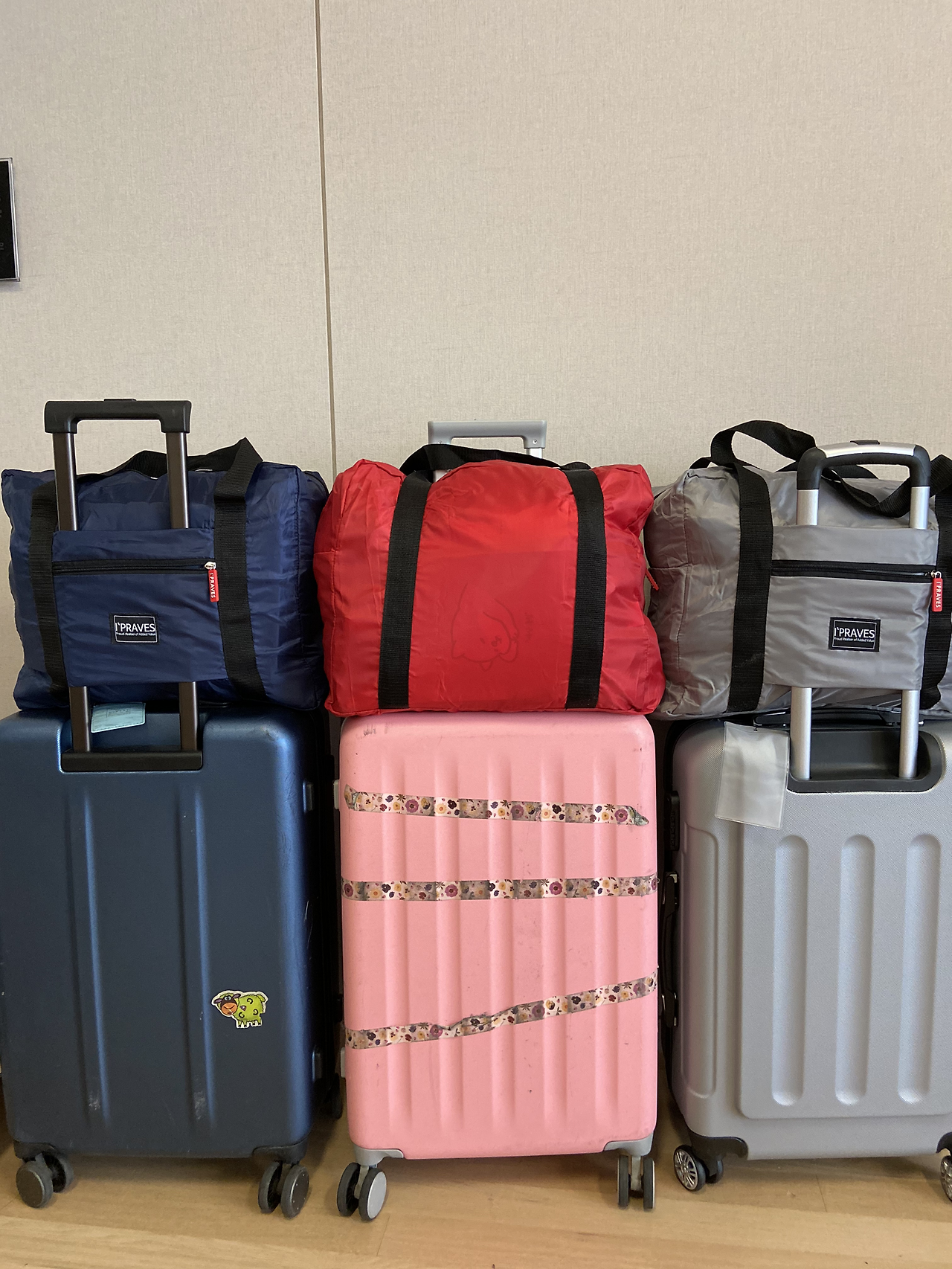 그랬던 내가 24인치 캐리어 3개에 그 위에 얹어서 들고 갈 수 있는 폴딩백 3개를 추가해 짐을 그득 채웠다. 2주간의 격리를 위한 짐이 한 달 여행을 위한 짐의 2,3 배 정도가 되는 셈이다.