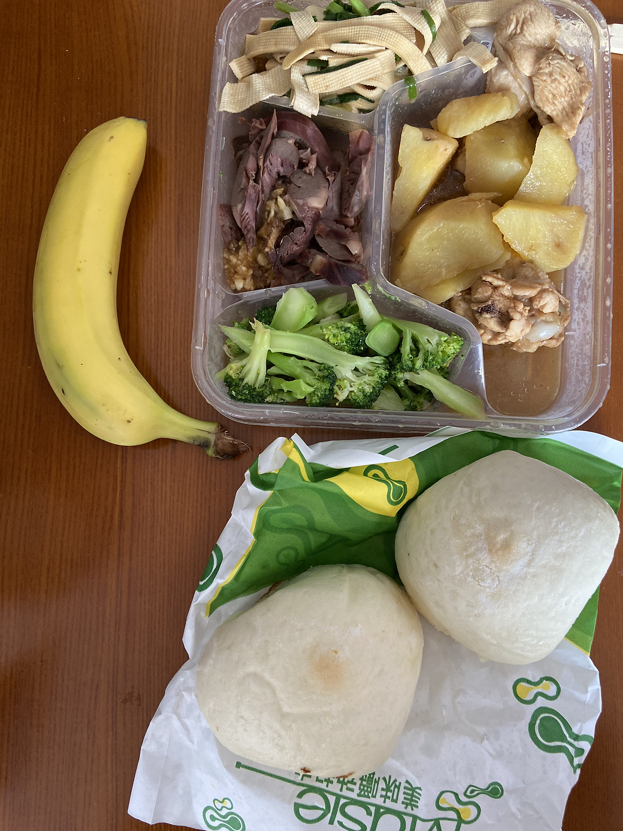 점심에는 만토우(馒头)**** 두 개와 볶은 야채 두 종류, 고기나 해물류 중 두 종류 그리고 과일 (과일은 하루에 딱 한 번 나온다)