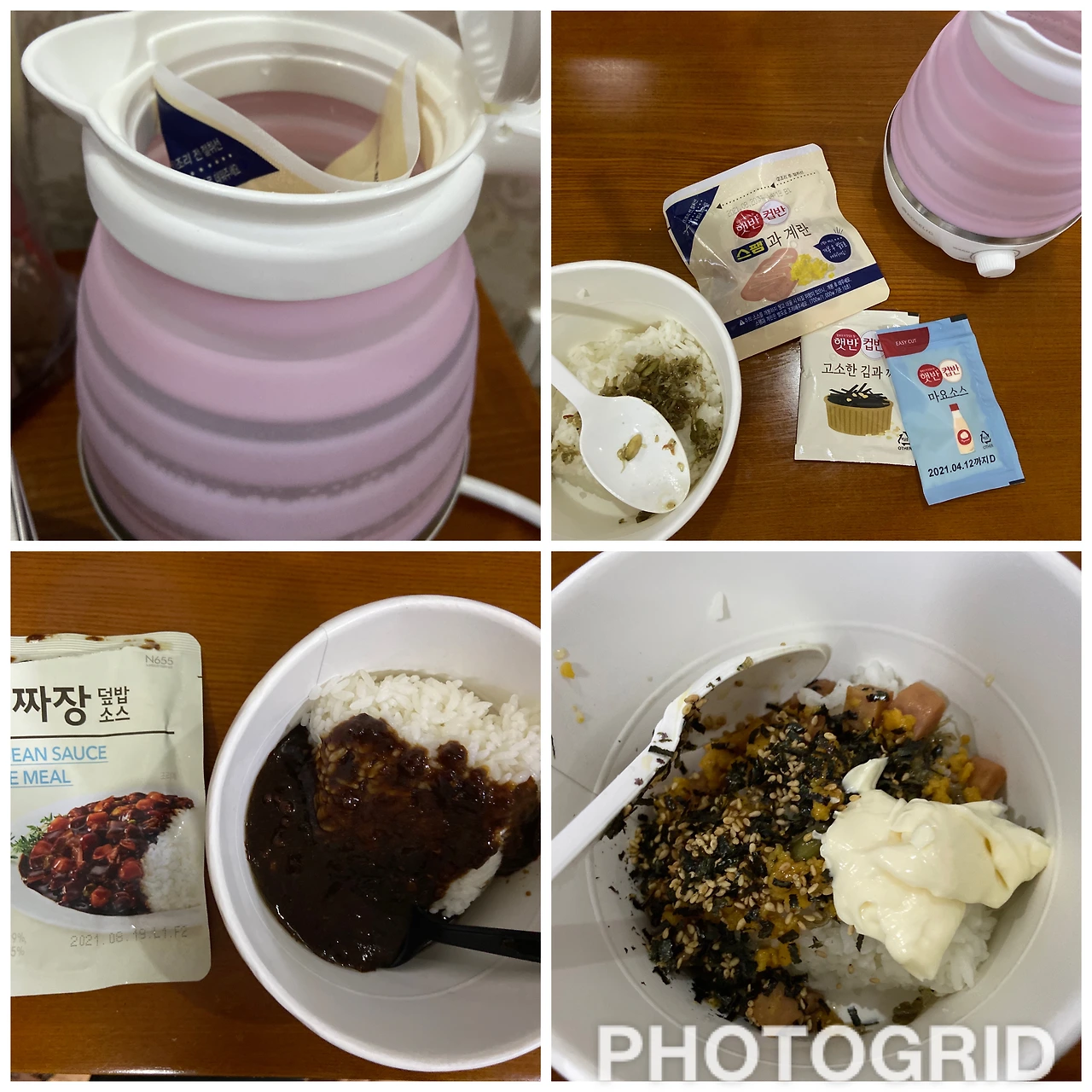 점심과 저녁 사이 아이들에게 간식으로 작은 컵라면을 준다. 그리고 유일하게 밥이 나오는 저녁밥을 반 남겨 아침에 덮밥 소스와 함께 준다. 아이들 온라인 수업이 8시 시작인데, 아침 도시락이 8시에 배달되니 생각해낸 방법이다.