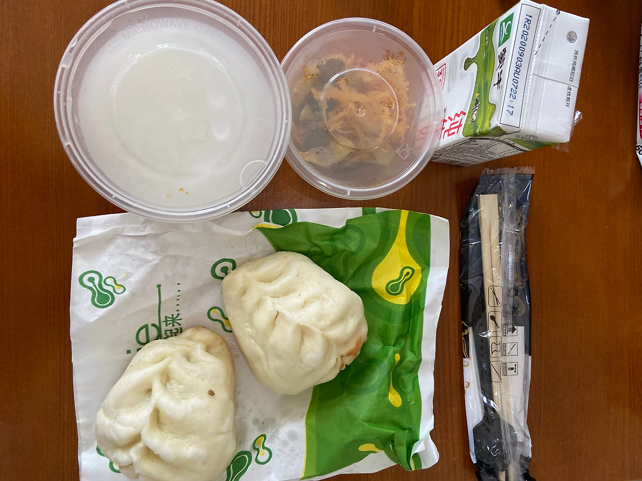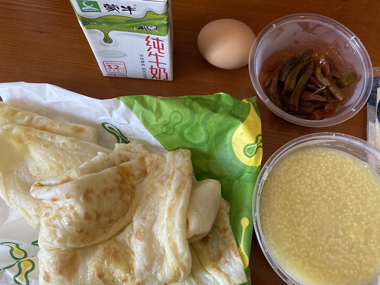 아침에는 사오빙(烧饼)*이나 젠빙(煎饼**) 등 빙(饼)이나 바오즈(包子)***, 좁쌀죽이나 팥죽, 흰 죽 같은 죽, 삶은 계란과 우유, 그리고 짠지 종류