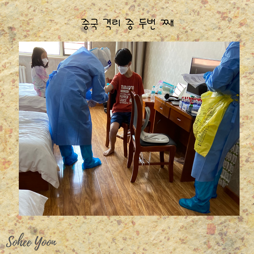 격리 4일째 방문 앞에 서서 검사했던 것과 달리 이번에는 의료진 두 명이 방안으로 들어왔다. 한 명씩 채혈을 하고, 목구멍 면봉을 넣어 핵산 검사를 했다.