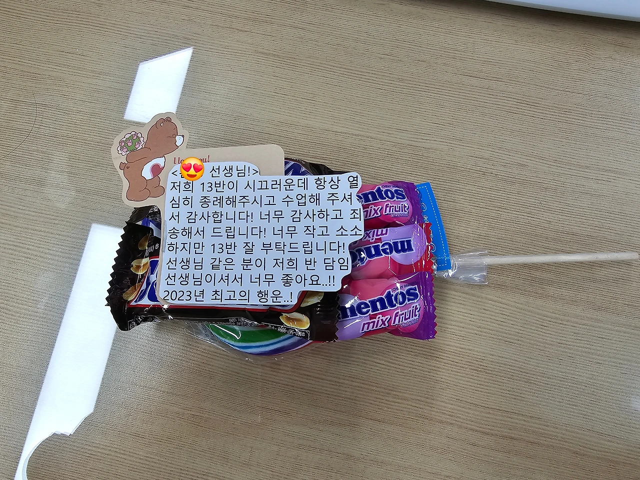 학생은 자신이 경품으로 받은 과자를 나누어드리는 것이니 괜찮을 것이라고 생각했고, 그 결과 과자들을 작게 소분해서 담임 선생님을 비롯한 모든 과목 선생님들께 감사 인사를 드렸던 것이었다. 예쁜 선물로 인해 교무실의 대부분의 선생님들이 기분 좋은 하루를 시작하셨고, 나는 학생 덕에 하루종일 어깨가 으쓱할 수 있었다.