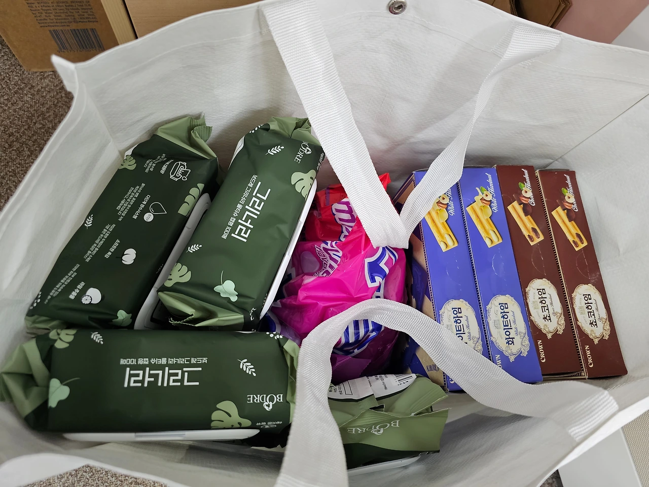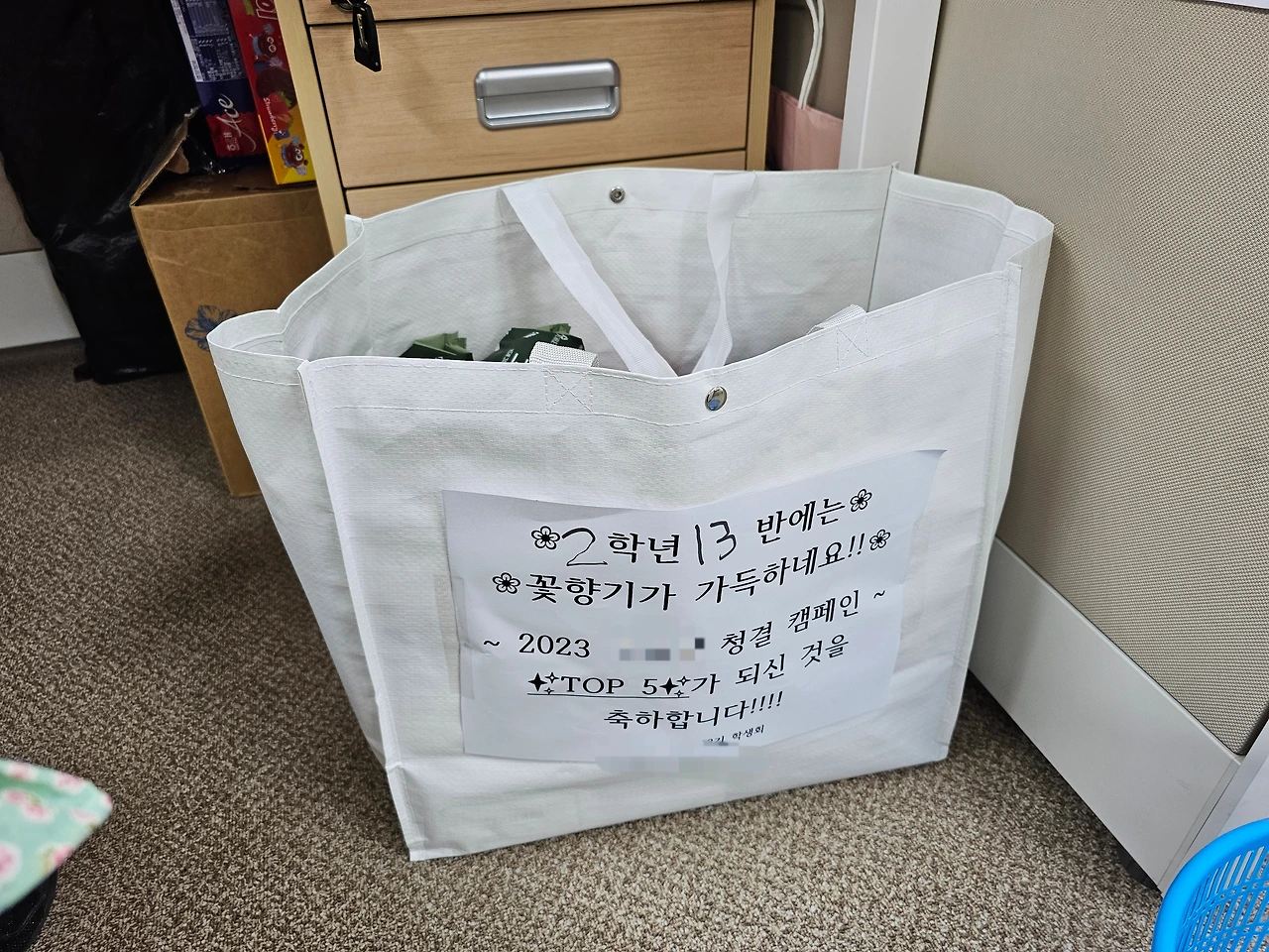며칠 뒤 자리에 놓인 커다란 가방에는 청결 캠페인 TOP5가 되신 것을 축하한다는 문구와 함께 열개의 물티슈와 과자들이 들어있었다. 아, 이게 저번에 그거구나. 교무실에서 상을 받은 반이 되자 괜히 뿌듯해지는 입꼬리를 주체하지 못하고, 신이 나서 가방을 들고 교실로 향했다.