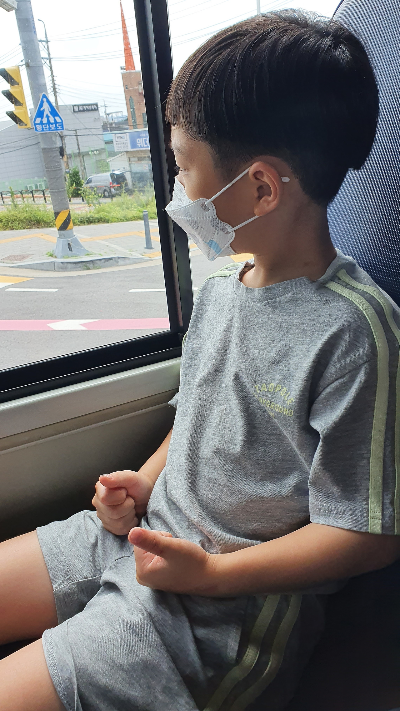 집 앞에서 버스를 기다리는데 '우리를 안 싣고 가면 어쩌지.' 초조함에 도로 쪽으로 몸을 쑤욱 늘려 얼굴을 빼꼼 내밀면서 버스가 올 때마다 쳐다보았다. 우리가 타려고 하는 버스가 오자 손을 뻗어 크게 흔들며 승차하고자 하는 의지를 강력하게 내비쳤다. 상윤이는 장애인인데 요금을 내는 것인가 안내는 것인가 그것도 잘 모르겠기에 그냥 '어른 한 명, 아이 한 명이요.' 하고 탑승했다. 나도 버스를 안 타본지가 백만 년이라 이 버스가 제대로 우리를 데려다 줄지 걱정이 되는데 하물며 상윤이는 어떠랴. 공항 가는 버스나 서울 갈 때 시외버스 같은 좌석버스는 몇 번 타본 적이 있지만 시내버스를 타 본 경험이 거의 없는 상윤이었다.