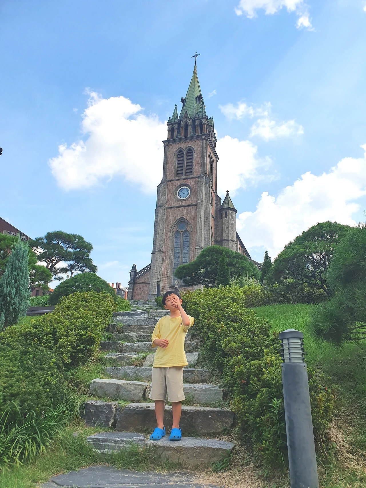 남산 케이블카를 타고 올라가는 그 길을 상윤이는 분명 좋아할 것이다. 편의점에 들러 간식과 음료수를 사고 지도 앱을 보며 걸어가는 길에 만난 명동성당은 그 역사적 의미만큼 묵직한 존재감을 드러냈다. 나라는 사람은 딱히 종교를 두고 있진 않다. 종교적 믿음에 대해 거부하는 것은 아니고, 오히려 모든 종교의 역사와 존재의 의미를 존중하고 이해하고자 하는 쪽이다. 어쩌면 나의 게으름과 종교에 대한 무관심을 에둘러 핑계 대고 있는 걸지도 모르겠다. 그러나 교회를 봐도 성당을 봐도 사찰을 둘러봐도 똑같이 그 신성함에 압도될 수 있는 건 내가 어느 한쪽으로 치우쳐 있지 않기 때문이라 믿는다. 이번엔 그저 지나가는 길의 포토 스폿에 불과했지만, 다음에는 조금 더 명동성당에 대한 이야기를 들어보고 둘러봐도 좋을 것 같다. 그러면 그저 봄날의 햇살을 빛나게 하는 예쁜 하늘과 푸르른 나무 같은 배경으로서의 의미가 아닌, 다른 의미를 눈에 담아낼 수 있지 않을까? 이 의미든 저 의미든 나는 다 좋지만...