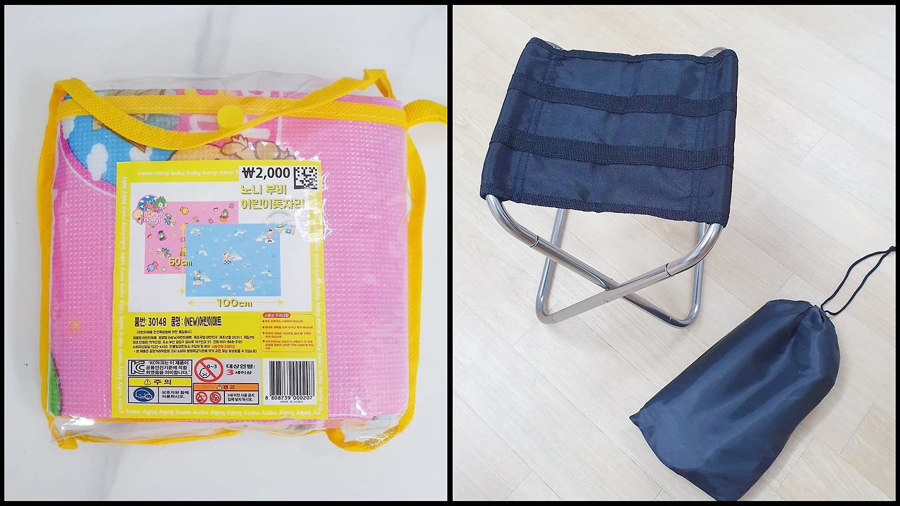 다이소 1인용 돗자리와 초경량 접이식 휴대용 의자 2개