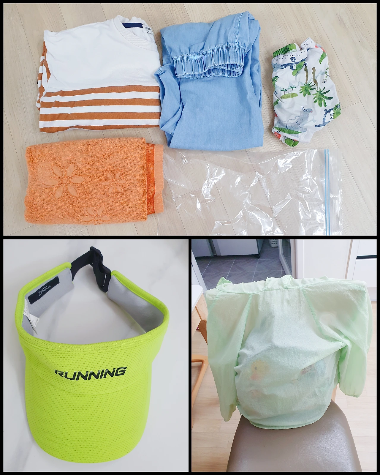 여벌 옷 풀세트와 수건, 휴대가 편한 모자, 얇은 외투