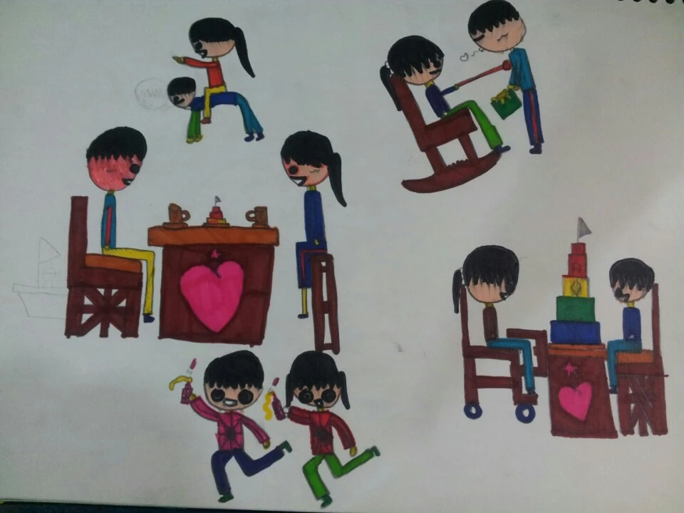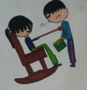 남자의 손에 뭐가 들려 있는데 꽃인지 아니면 그냥 선물인지 아니면 뭘 가져오라고 했는지... 아무튼 뭔가 들려 있습니다. 의자에 앉은 아이가 남자 가슴에 뭔가를 댄 거를 보면 뭘 시켰는데 마음에 들지 않았나 봅니다.