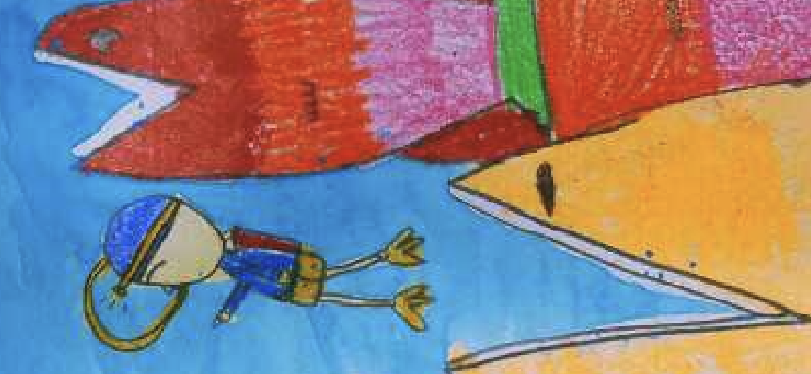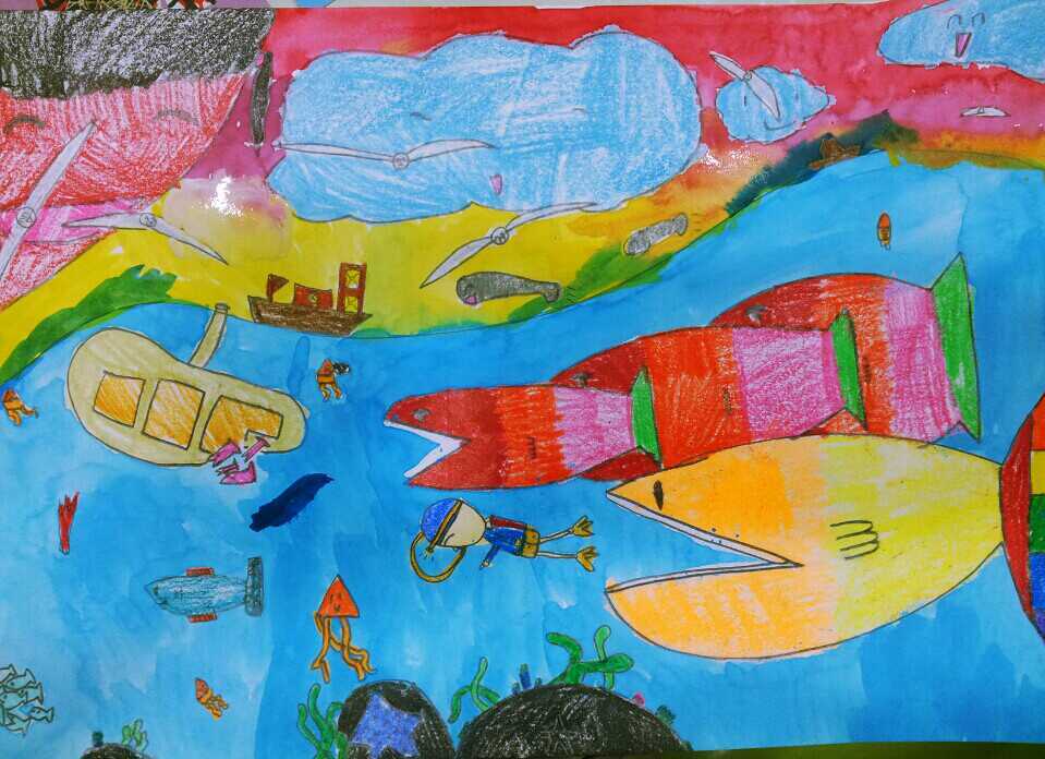 대부분 아이들은 바다나 물고기를 대상으로 그림을 그릴 때 바닷속만 한정하여 표현할텐데, 우리 아이는 성격을 그대로 반영하여 바닷속만이 아니라 바다를 중심에 두고 하늘과 땅 주변의 사물들도 함께 표현하였습니다. 태양과 구름, 선창장, 바다 위의 배, 갈매기 떼들, 물고기와 오징어, 바다를 탐험하는 스킨스쿠버하는 사람 등등.