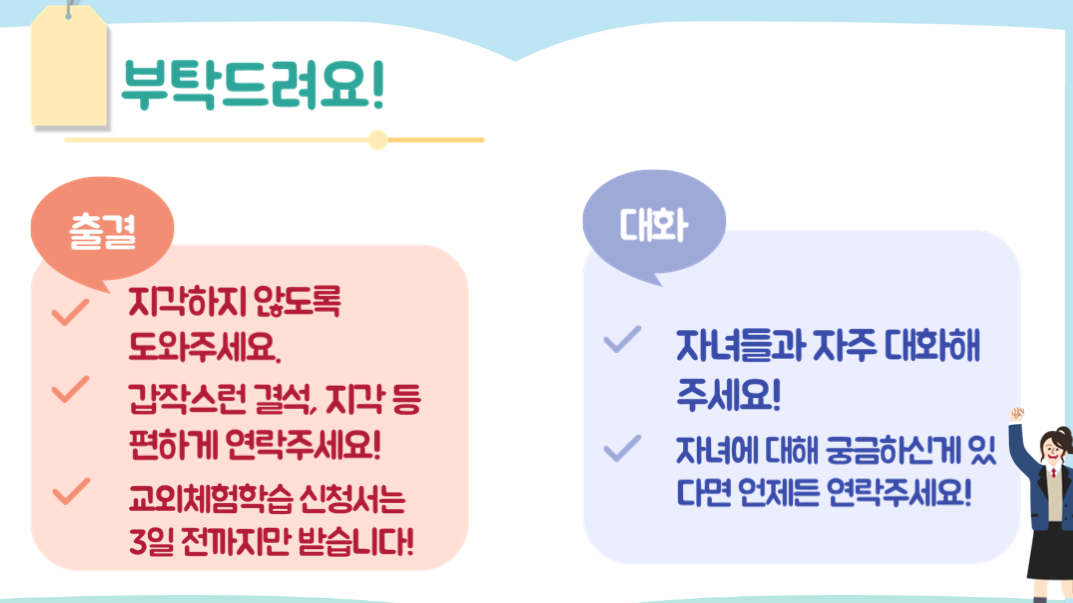 "선생님 내일은 코로나 이후 처음 대면으로 개최하는 학부모총회입니다. 그동안 총회 준비하느라 고생 많으셨습니다. 힘드시겠지만 학부모님 한 분 한 분 성심성의 껏 응대해 주길 부탁드립니다. 학부모님 입장에서는 10분도 채 안 되는 선생님과의 만남을 위해 정말 어려운 발걸음을 하신 겁니다.