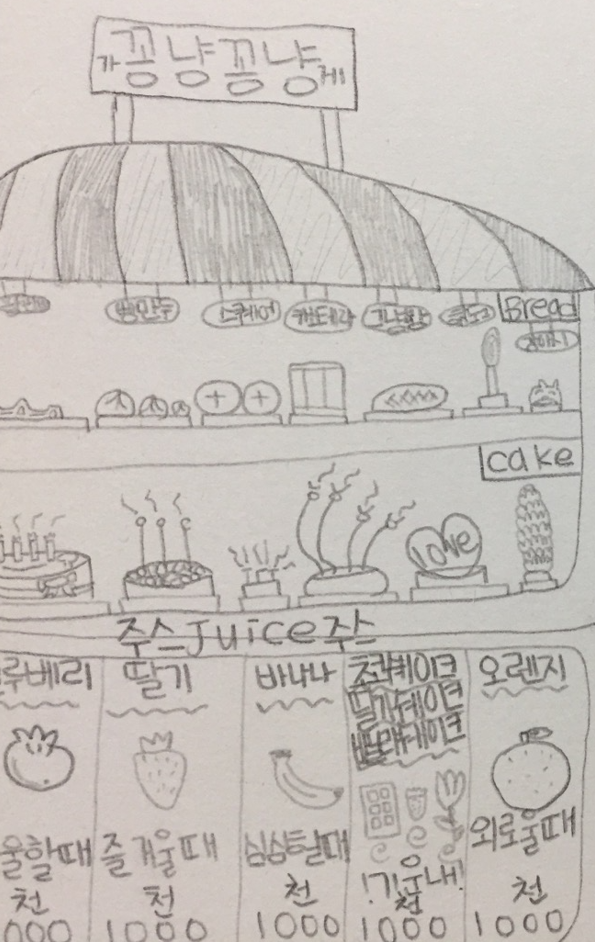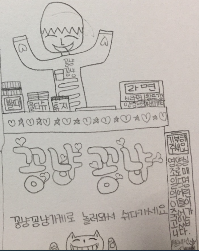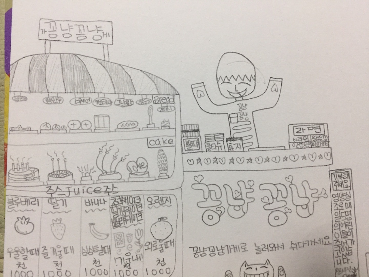 '꽁냥꽁냥' 가게명을 아주 예쁘게 꾸민 것도 눈에 띕니다. 고양이가 웃으면서 놀러 와서 쉬다 가라고 유혹하고 있고요. 이때도 고양이 키우고 싶다고 떼를 썼는데 고등학생이 되어서야 고양이를 키웠답니다. 초등학교 때부터 반려동물을 키웠으면 어땠을까? 하는 아쉬움이 큽니다.