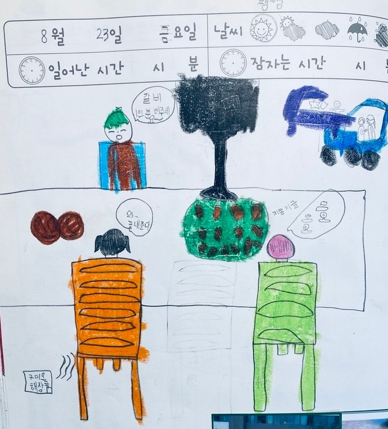 하지만 퇴직 후 캠핑카로 전국일주를 하고 싶은 꿈은 있습니다. 거의 매일 유튜브로 캠핑카를 봐서 아이가 이런 그림을 그린 것 같습니다.