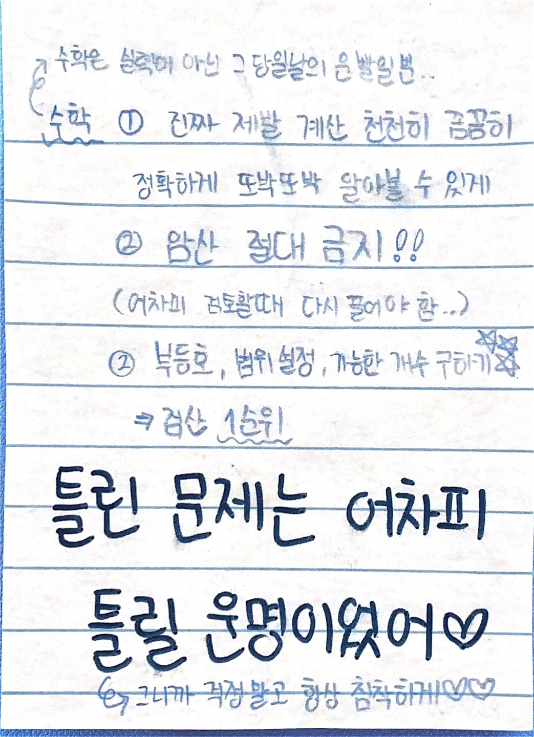 아침에 교실에 들어갔더니 어떤 학생의 책상 위에 놓여 있는 친구의 응원 메시지입니다. 스트레스 받는 시험일텐데 이런 와중에도 우정이 싹트고 있는 걸보니 시험이 이런 좋은 점도 있나봅니다.